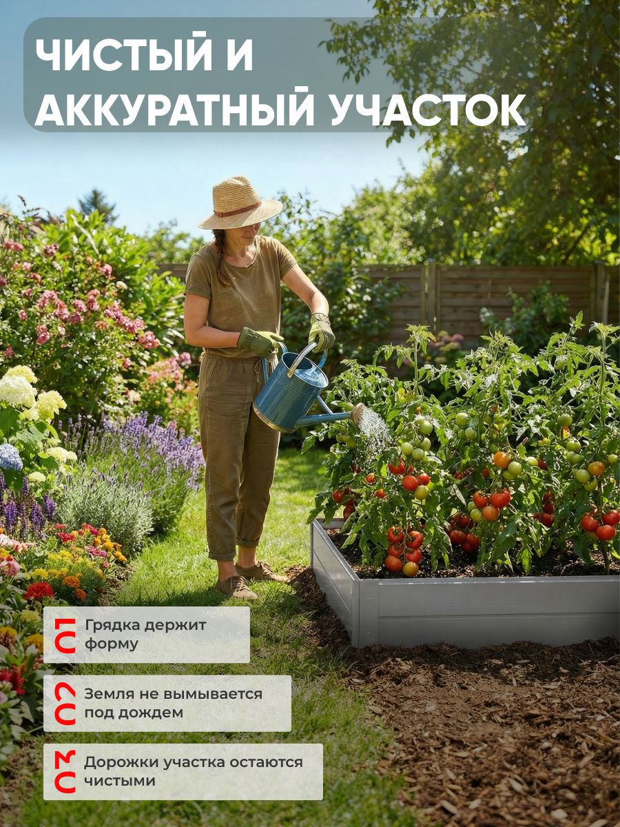 Металлическая грядка предназначена для сада и дачи. Она выполнена в популярном оттенке серый, соответствующем стандарту RAL 7004. Благодаря оптимальной высоте борта 20см и размеру 1х1 метра, изделие идеально подходит для выращивания ягод, зелени, пряных трав, а также цветов. Ивановская грядка обеспечивает аккуратный вид участка, помогает организовать пространство и облегчает уход за растениями. Современный металлический материал устойчив к погодным условиям, не деформируется и не подвержен гниению, что гарантирует долгий срок службы даже при интенсивном использовании на открытом воздухе. Прочное покрытие защищает от коррозии, сохраняя привлекательный внешний вид и насыщенный цвет на протяжении многих сезонов. Установка осуществляется с помощью саморезов, что делает сборку быстрой и удобной даже для начинающих садоводов.Серая конструкция гармонично вписывается в любой ландшафт, подчеркивая естественную красоту сада или дачи. Грядка подходит для размещения на различных типах почвы, помогает поддерживать порядок на участке и предотвращает разрастание сорняков. Металлическая основа обеспечивает устойчивость, а оптимальная высота борта позволяет легко ухаживать за растениями без лишних усилий.Продукт предназначен для тех, кто ценит практичность и аккуратность в организации пространства для выращивания растений. Грядка подойдет для оформления клумб, высадки сезонных культур, обустройства уголков для любимых ягод или декоративных цветов. Благодаря компактным размерам, изделие можно использовать даже на небольших участках, создавая красивые и функциональные зоны для посадки.Использование серая металлическая грядка — это современное решение для сада и дачи, позволяющее рационально использовать территорию и получать отличный результат от выращивания растений. Качественный материал и надежное соединение элементов обеспечивают долговечность и удобство эксплуатации.