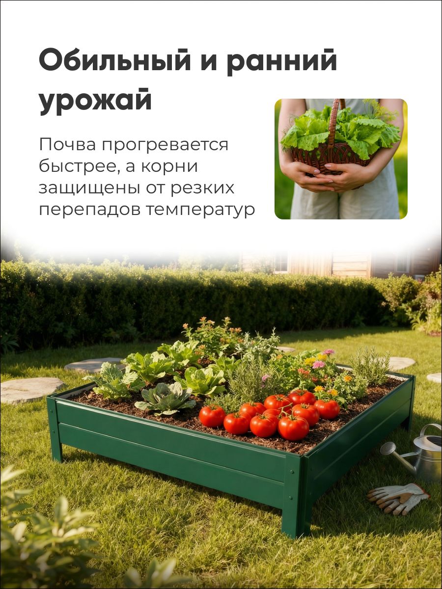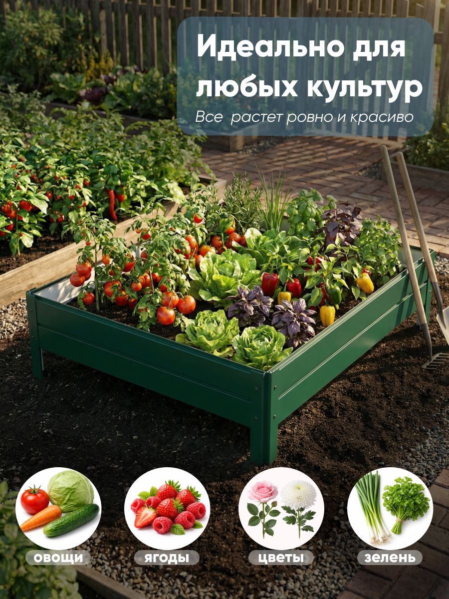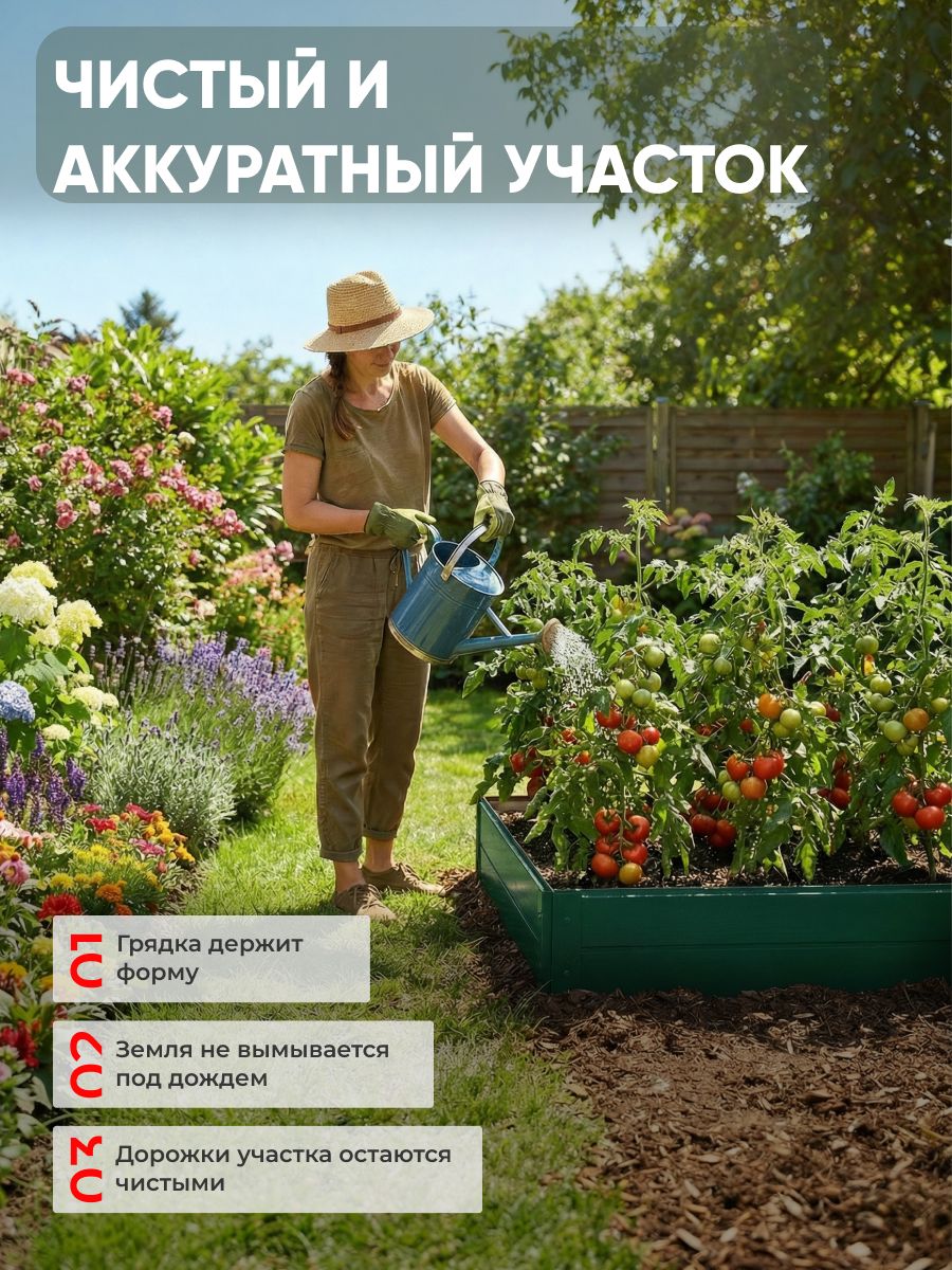 Металлическая грядка предназначена для сада и дачи. Она выполнена в популярном оттенке зеленый мох, соответствующем стандарту RAL 6005. Благодаря оптимальной высоте борта 20см и размеру 1х1 метра, изделие идеально подходит для выращивания ягод, зелени, пряных трав, а также цветов. Ивановская грядка обеспечивает аккуратный вид участка, помогает организовать пространство и облегчает уход за растениями. Современный металлический материал устойчив к погодным условиям, не деформируется и не подвержен гниению, что гарантирует долгий срок службы даже при интенсивном использовании на открытом воздухе. Прочное покрытие защищает от коррозии, сохраняя привлекательный внешний вид и насыщенный цвет на протяжении многих сезонов. Установка осуществляется с помощью саморезов, что делает сборку быстрой и удобной даже для начинающих садоводов.Зеленая конструкция гармонично вписывается в любой ландшафт, подчеркивая естественную красоту сада или дачи. Грядка подходит для размещения на различных типах почвы, помогает поддерживать порядок на участке и предотвращает разрастание сорняков. Металлическая основа обеспечивает устойчивость, а оптимальная высота борта позволяет легко ухаживать за растениями без лишних усилий.Продукт предназначен для тех, кто ценит практичность и аккуратность в организации пространства для выращивания растений. Грядка подойдет для оформления клумб, высадки сезонных культур, обустройства уголков для любимых ягод или декоративных цветов. Благодаря компактным размерам, изделие можно использовать даже на небольших участках, создавая красивые и функциональные зоны для посадки.Использование зеленая металлическая грядка — это современное решение для сада и дачи, позволяющее рационально использовать территорию и получать отличный результат от выращивания растений. Качественный материал и надежное соединение элементов обеспечивают долговечность и удобство эксплуатации.