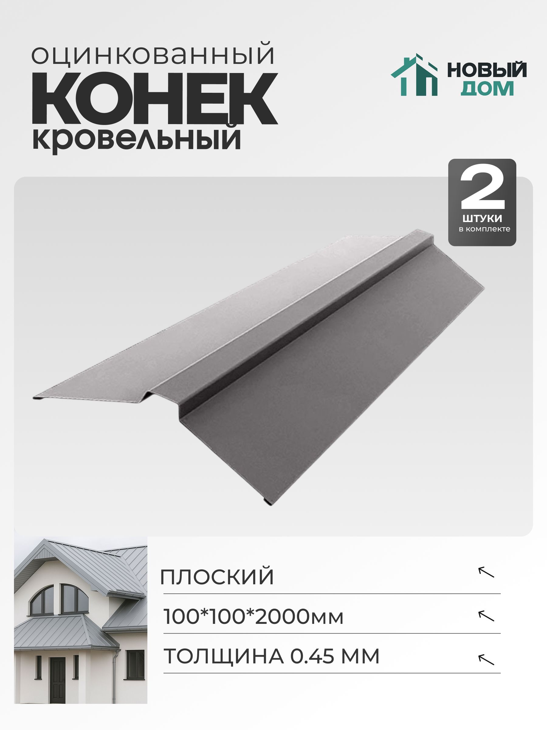 Конек кровельный плоский 100*100*2000мм представляет собой комплект из двух оцинкованных изделий, изготовленных из стали толщиной 0,45 мм.