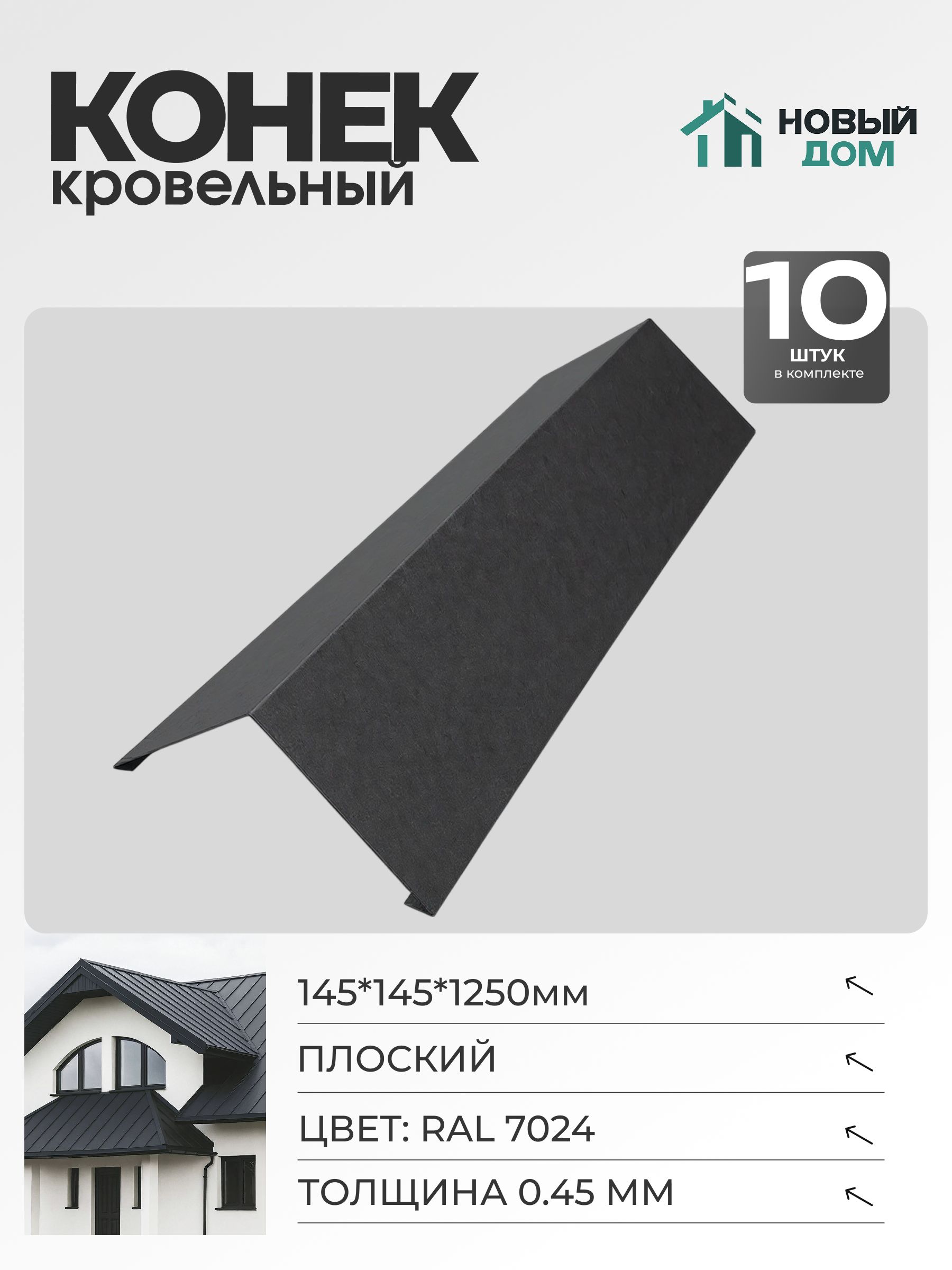 Комплект поставки включает 10 штук коньков, что обеспечивает достаточное количество материала для покрытия крыши.