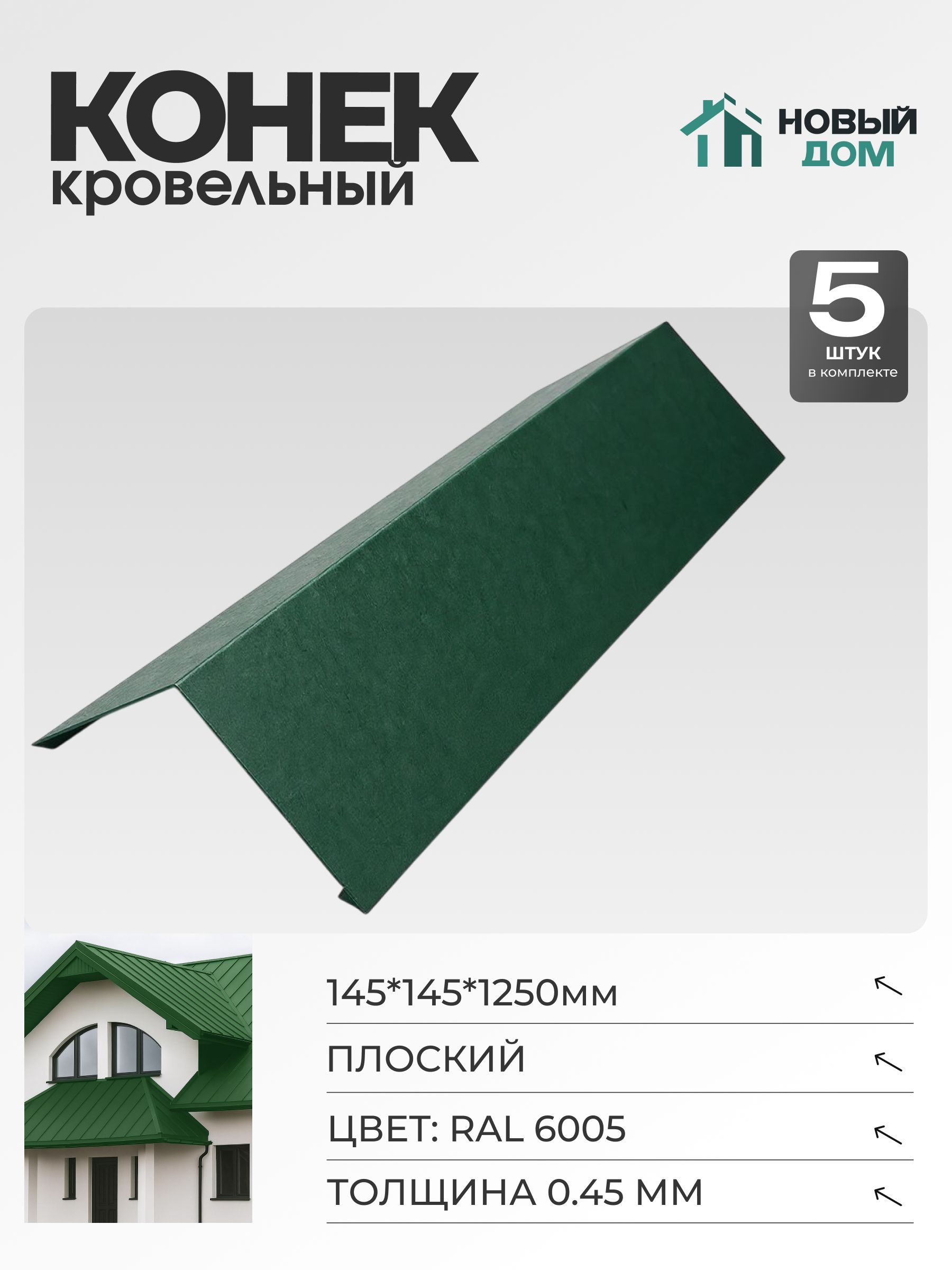 Конёк кровельный (планка конька плоского) представляет собой комплект из 5 штук, размером 145*145*1250мм. Изготовлен из оцинкованной стали с полимерным покрытием толщиной 0,45мм, что обеспечивает высокую прочность и долговечность. Цвет изделия - зеленый, соответствующий RAL6005.