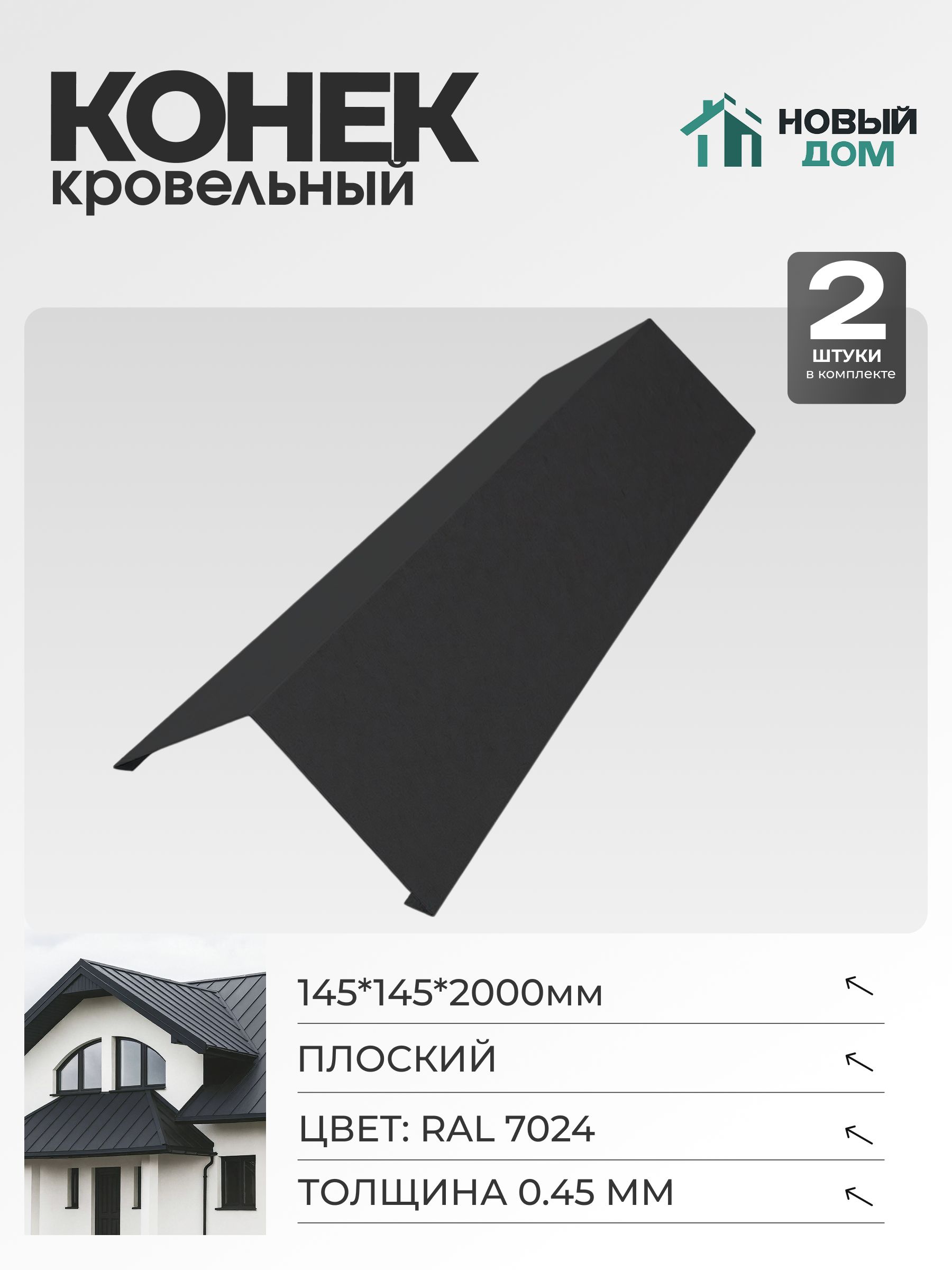 Конёк кровельный выполнен из стали толщиной 0,45 мм, что гарантирует его прочность и долговечность. Ширина и глубина планки составляют 14,5 см каждая, а длина – 2000 мм, что позволяет использовать его на крышах различных размеров и форм.
