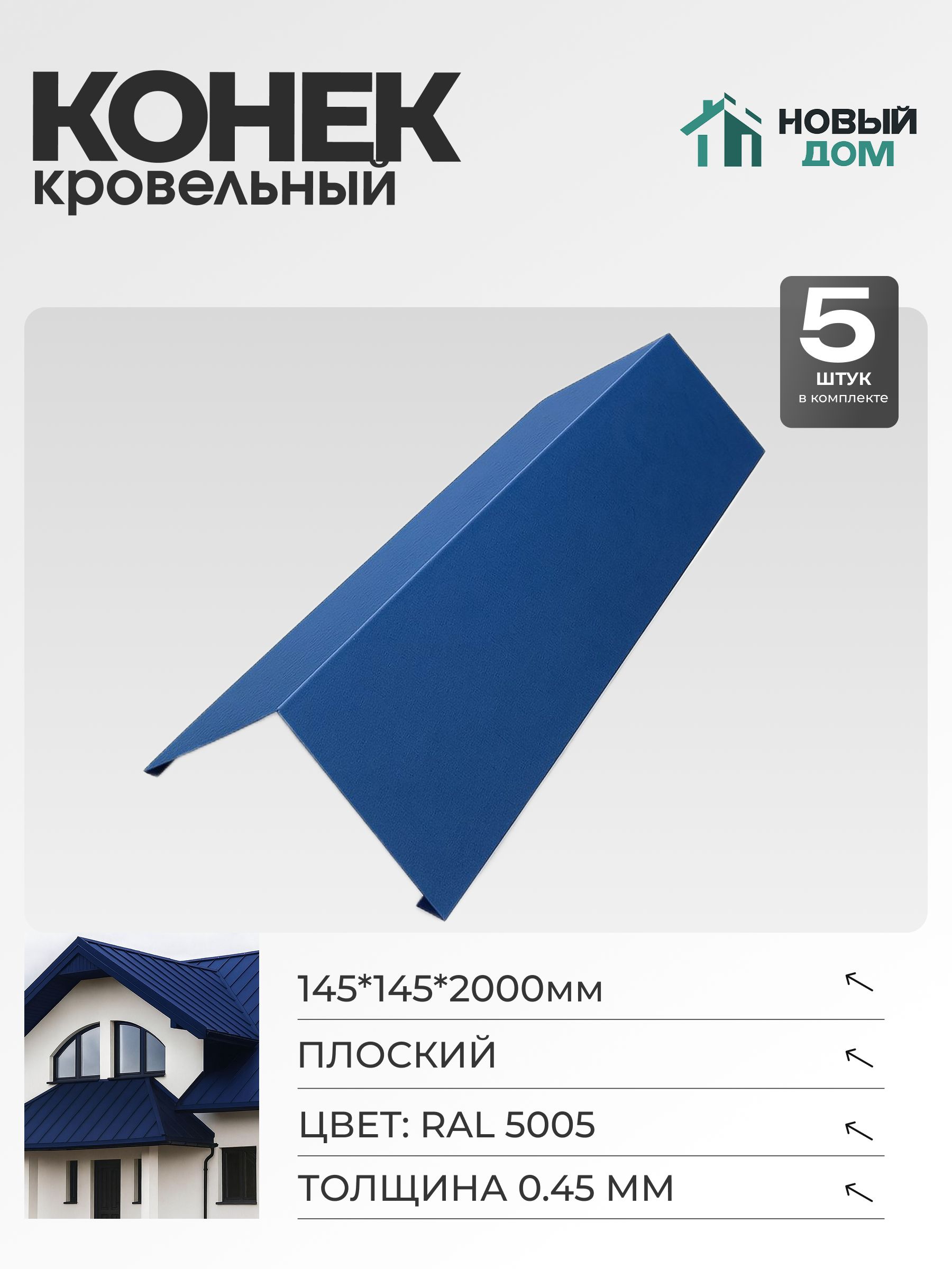 Конек кровельный — элемент, предназначенный для оформления верхней части крыши и защиты стыка скатов от влаги, снега и пыли. Плоская форма изделия позволяет удобно применять его как на жилых, так и на хозяйственных постройках. Благодаря современному производству конька створки прилегают к кровельному покрытию максимально плотно, обеспечивая герметичность и стойкость к ветровым нагрузкам. Рекомендуется монтаж в финальной стадии кровельных работ для завершения конструкции крыши.Данный комплект, включающий 5шт, позволяет выполнить монтаж сразу на нескольких объектах или обеспечить запас для частной или коммерческой застройки. Цвет Синий выбран по каталогу (RAL 5005), что позволяет проводить гармоничное сочетание с остальными кровельными материалами и фасадом здания. Это решение подходит для домов с различными архитектурными особенностями, а оттенок синего не теряет свою яркость со временем благодаря стойкому защитному покрытию.Габариты 145*145*2000мм обеспечивают универсальное применение: изделие подходит для большинства стандартных скатных крыш. Толщина 0,45мм способствует сохранению формы даже при высоких эксплуатационных нагрузках. Материал изготовления выдерживает температурные перепады, эффективен при различных климатических условиях и не подвержен коррозии, что значительно увеличивает срок службы без требования регулярного обслуживания.(Планка поверхности обеспечивает дополнительную защиту и создает завершенный внешний вид кровли. С помощью кровельной детали обеспечивается отвод влаги, предотвращается просачивание осадков в подкровельное пространство, что особенно важно для сохранения утеплителя и стропильной системы в исходном виде. Долговечность и надежность детали соответствуют высокому качеству современных строительных материалов.Особое внимание уделяется простоте в монтаже: прямые линии изделия удобно закрепляются к обрешетке, а прочное защитное покрытие предупреждает появление сколов и царапин вследствие эксплуатации.