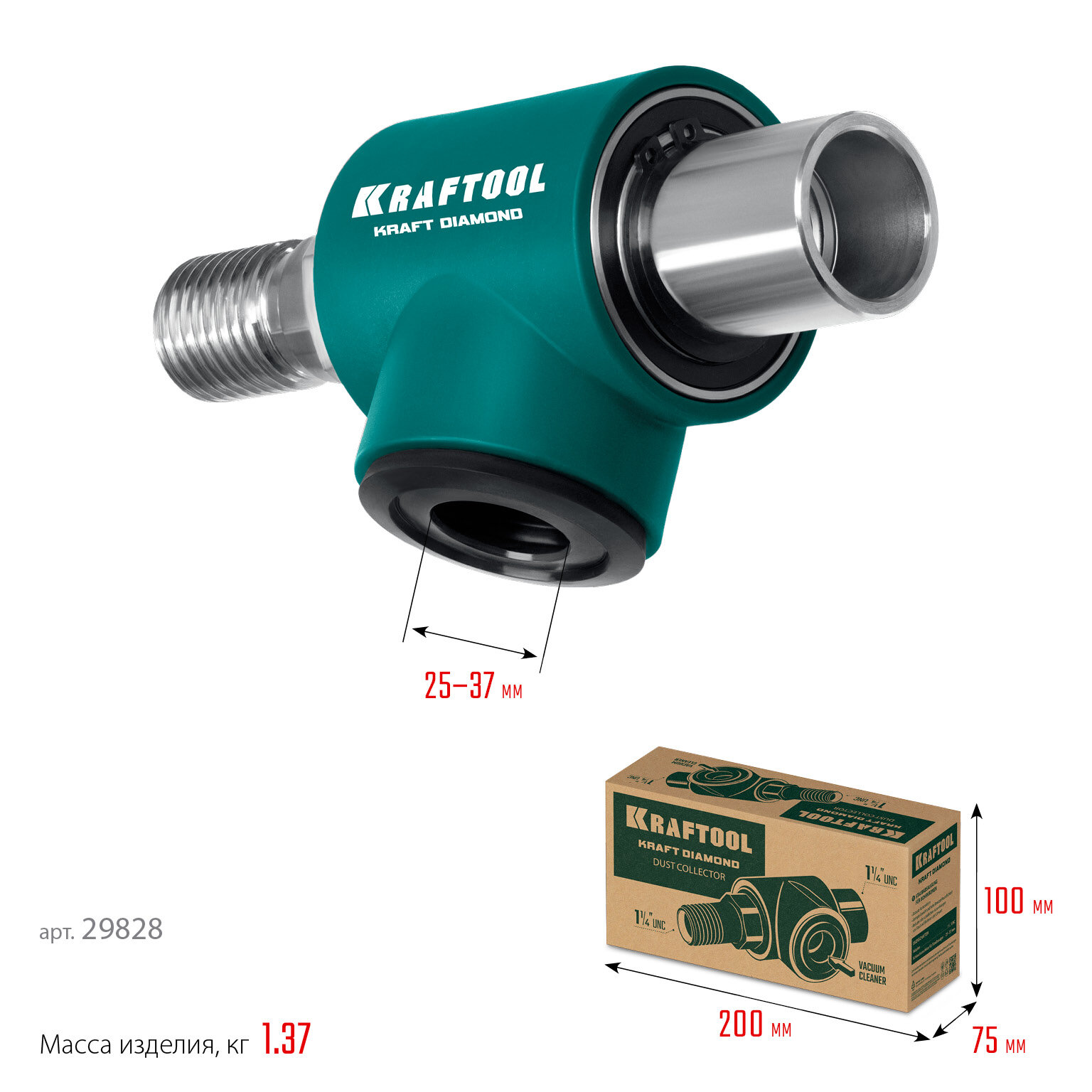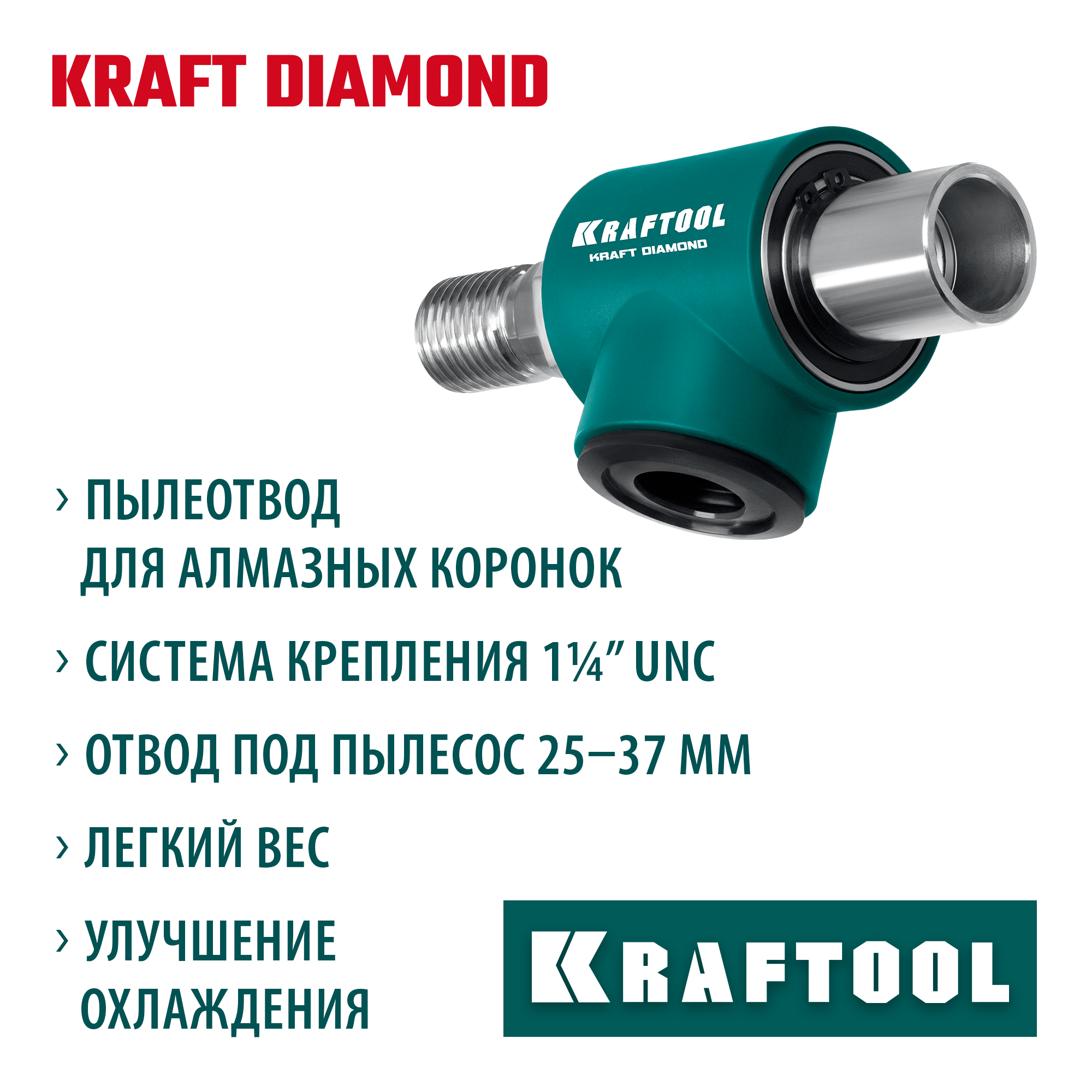 Предназначен для отвода пыли и крупных частиц в процессе сверления алмазными коронками, работает с пылесосами. Для использования с установками и дрелями алмазного бурения с посадкой 1/2″ и 1 1/4″ - UNC через переходник.