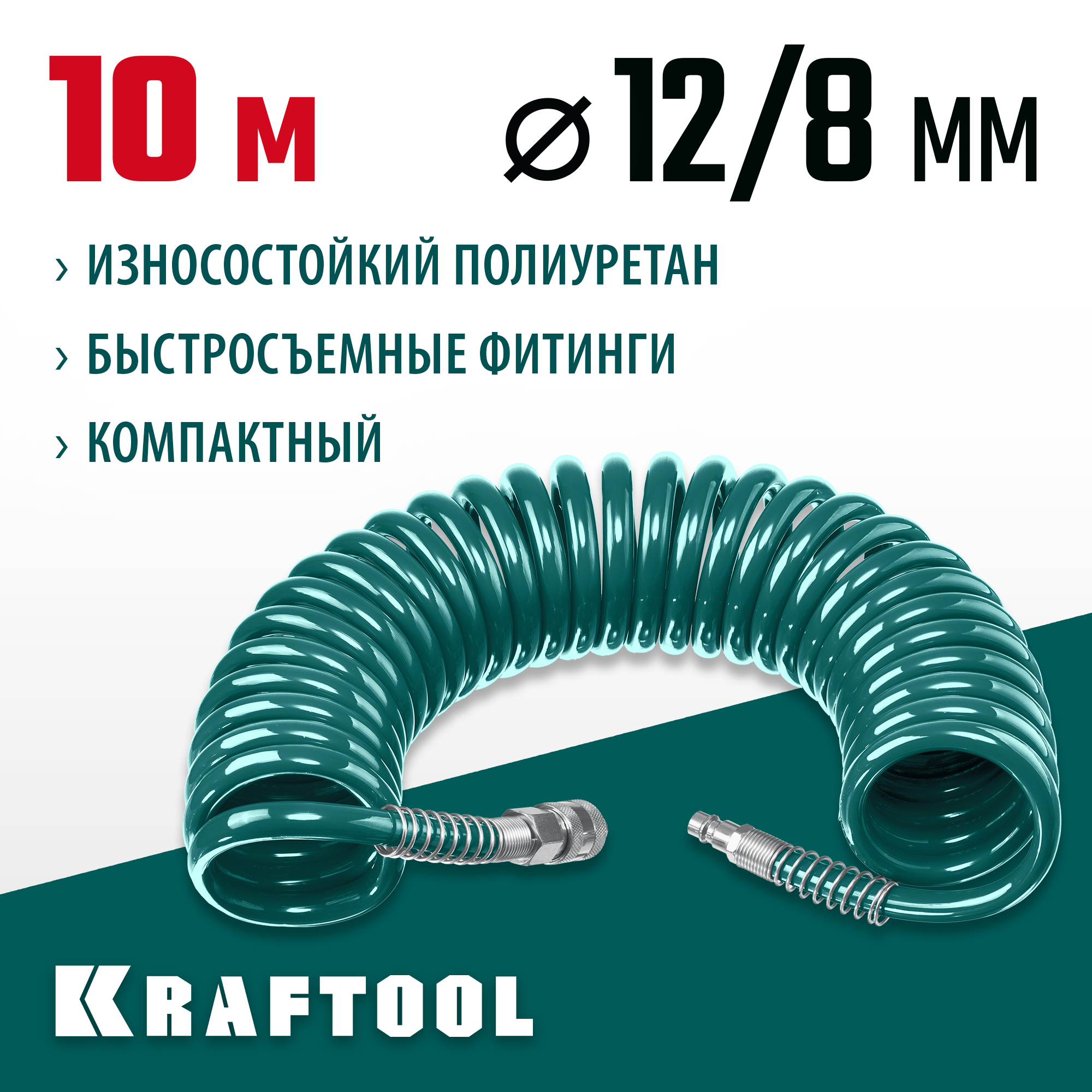 KRAFTOOL 10 м, 8 х 12 мм, 15 бар, воздушный спиральный шланг с фитингами рапид (06590-10)