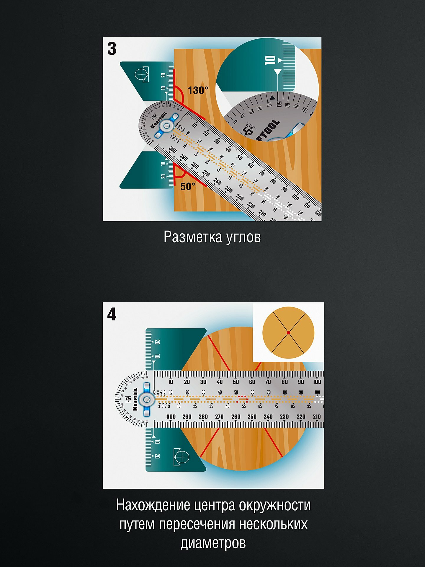 Для точной разметки параллельных линий, углов от 0° до 180° контроля поверхностей различной формы при столярных и плотницких работах.