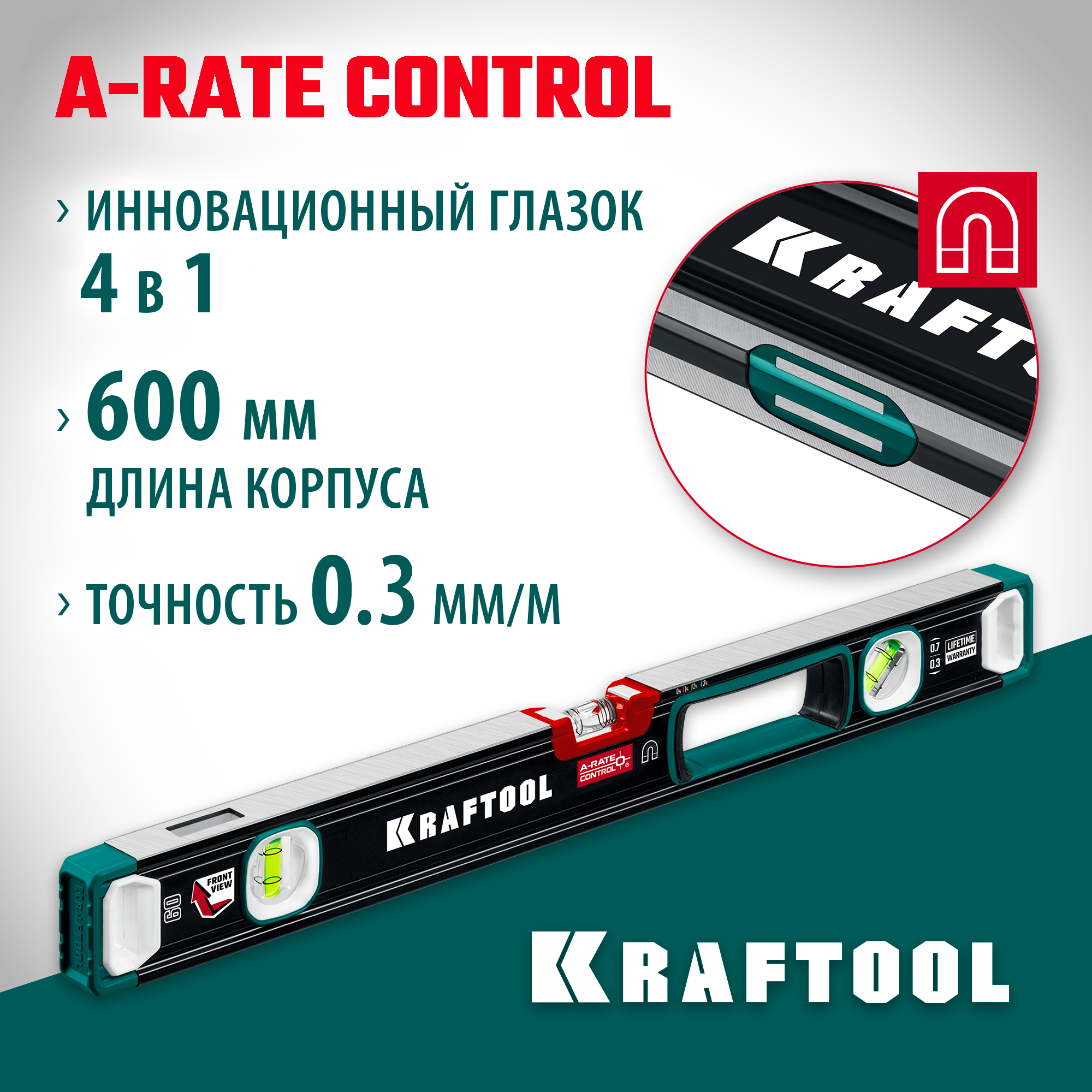 KRAFTOOL A-RATE CONTROL, 600 мм, точность 0.3 мм/м, с зеркальным глазком, сверхпрочный магнитный уровень (34988-60)