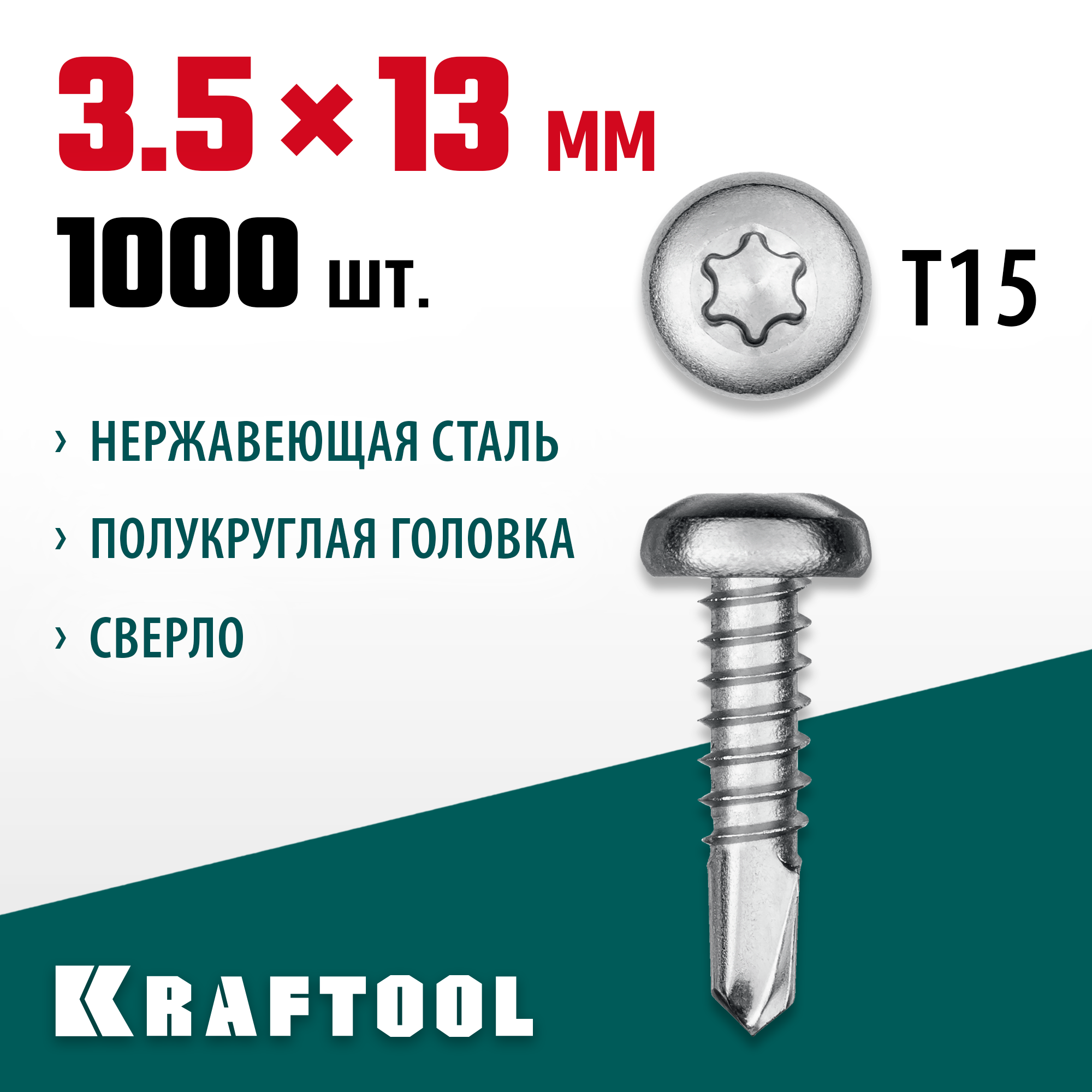 Саморезы KRAFTOOL DS-P оснащены полукруглой головкой с плоской площадкой, что позволяет равномерно распределить нагрузку на поверхность и предотвращает образование трещин и сколов. Головка имеет шлиц TORX, который обеспечивает надежное закручивание и предотвращает срывание биты.