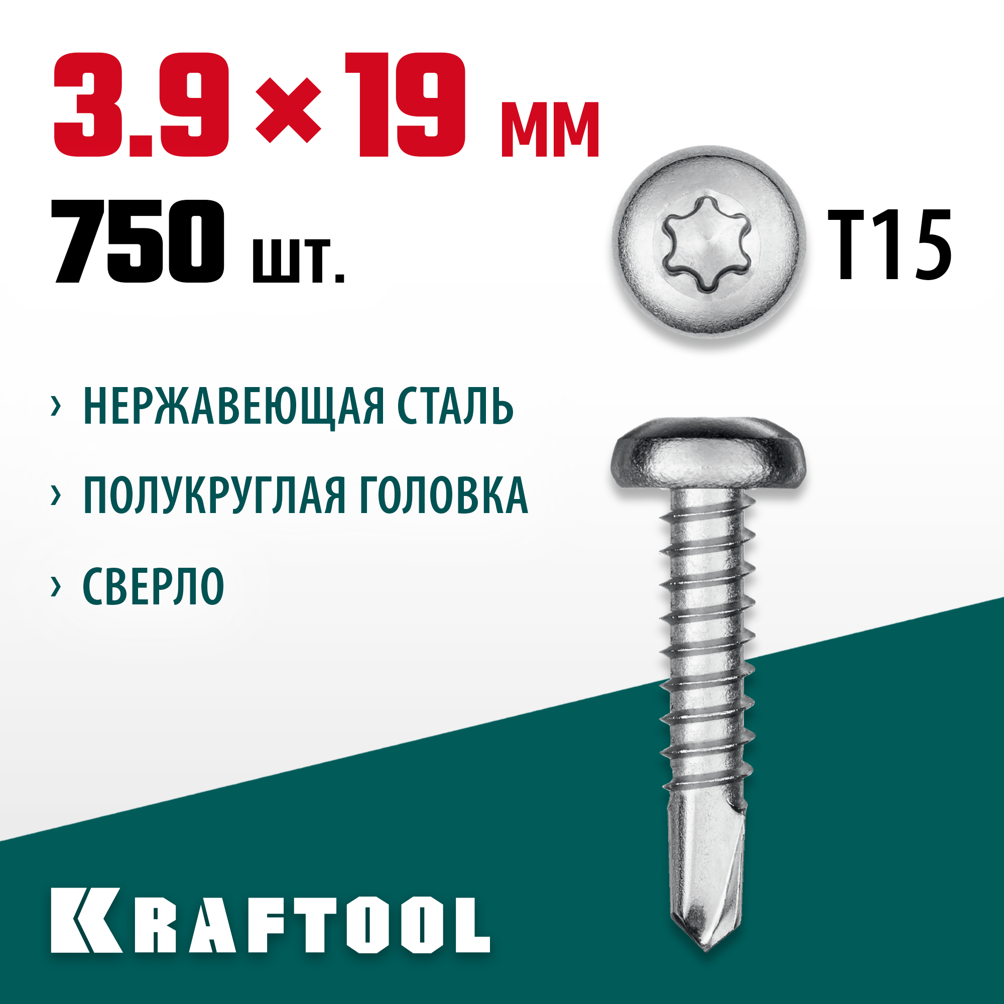 Саморезы KRAFTOOL DS-P оснащены сверлом, что облегчает процесс вкручивания. Полукруглая головка с плоской площадкой обеспечивает надежное крепление и эстетичный вид. Шлиц TORX предотвращает срывание биты при закручивании и обеспечивает большой крутящий момент.