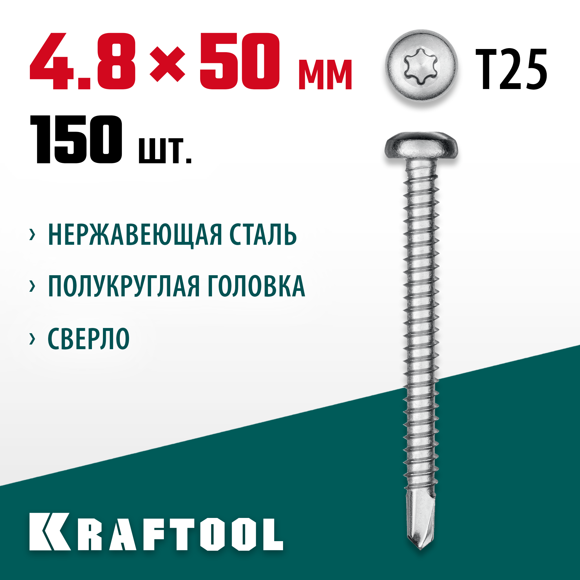 Саморезы KRAFTOOL DS-P оснащены сверлом, что облегчает процесс вкручивания. Полукруглая головка с плоской площадкой обеспечивает надежное крепление и эстетичный вид. Шлиц TORX предотвращает срывание биты при закручивании и обеспечивает большой крутящий момент.
