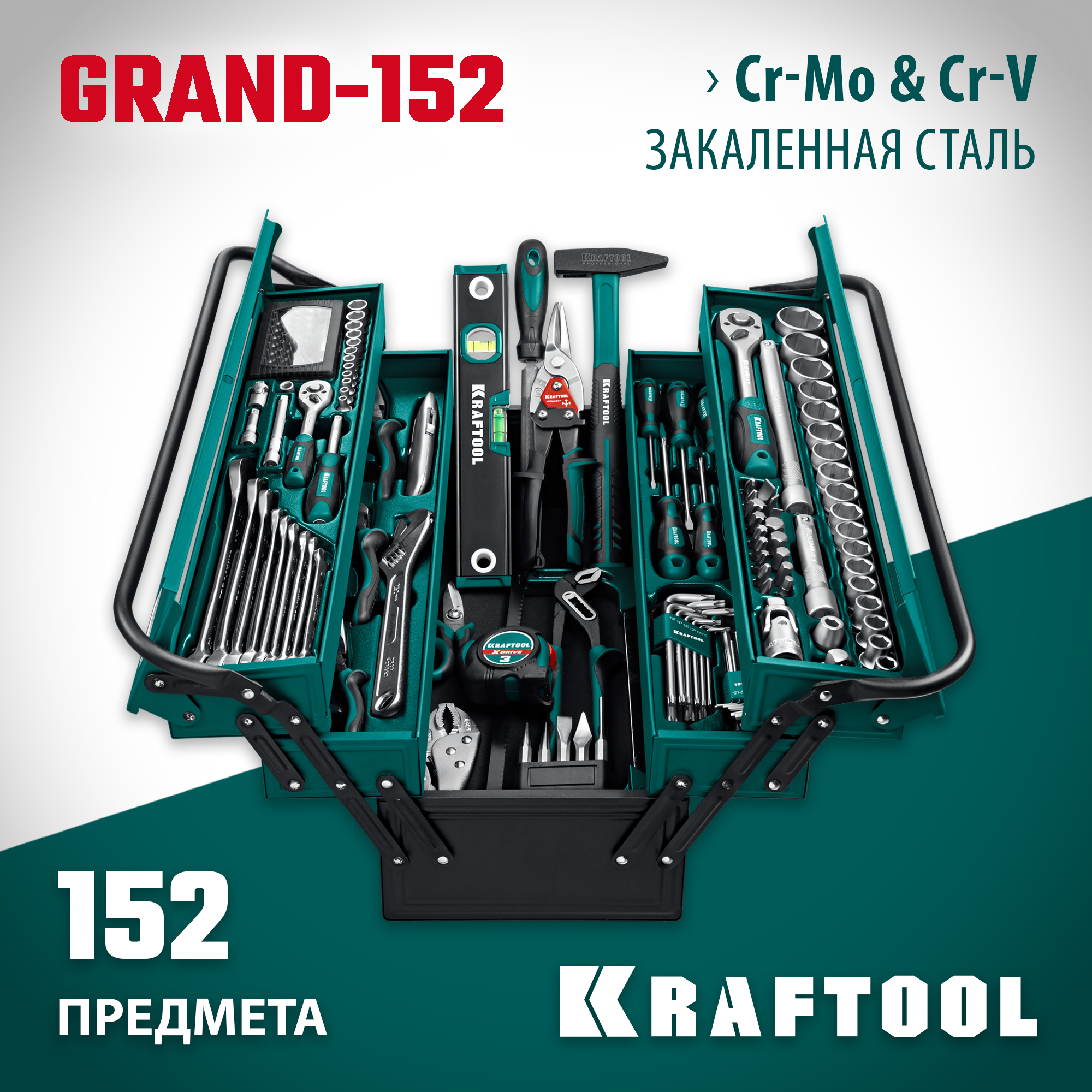 KRAFTOOL GRAND-152 - это многофункциональный набор высококачественного профессионального инструмента, предназначенный для слесарно-монтажных работ. В комплекте 152 предмета, включая размеры 1/2″ и 1/4″.