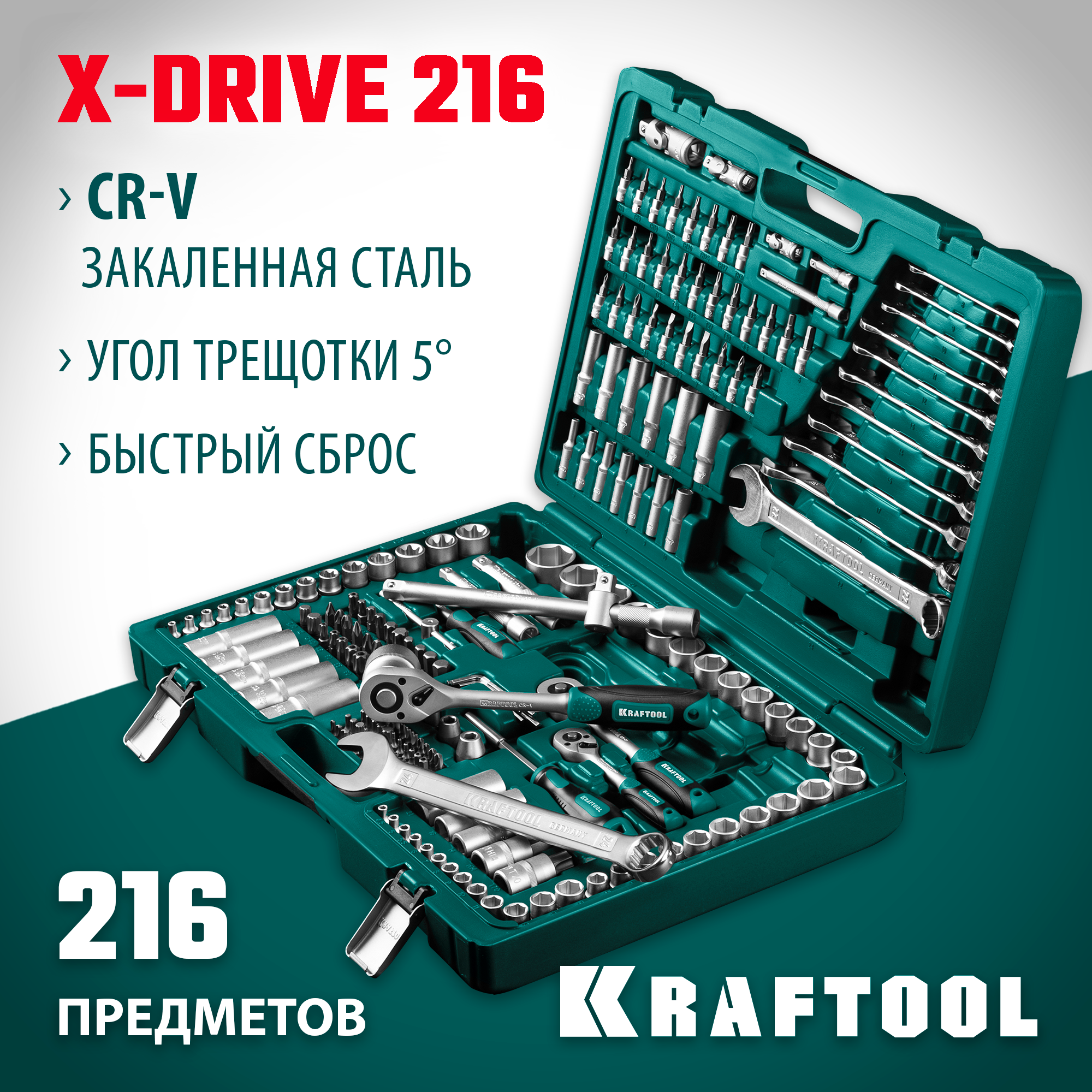 KRAFTOOL X Drive - это профессиональный набор инструментов, состоящий из 216 предметов. Он включает в себя размеры 1/2″, 3/8″ и 1/4″, что позволяет работать с различными видами крепежа.