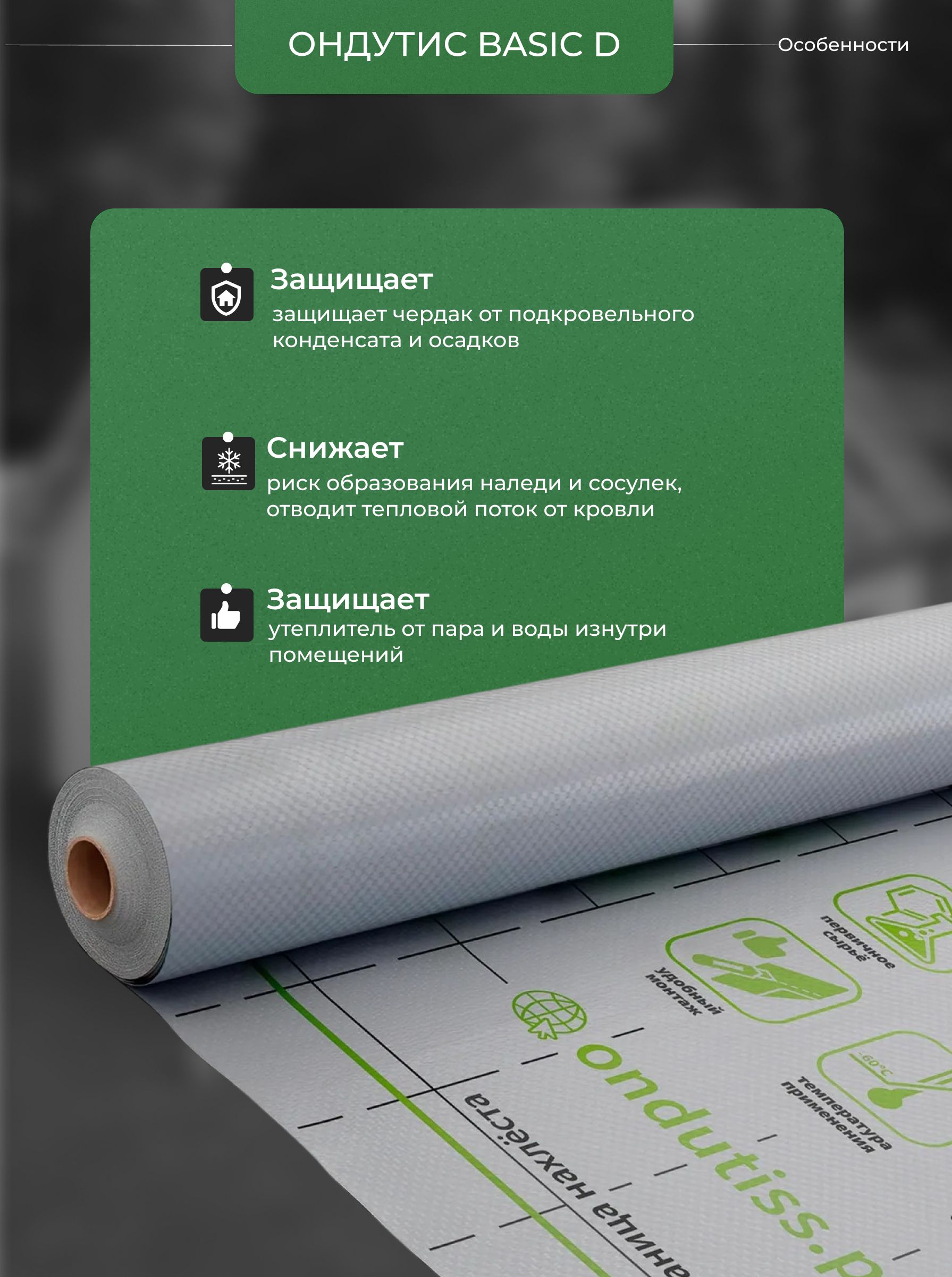 С помощью ONDUTISS BASIC D вы можете надежно предотвратить проникновение воды и образование конденсата, что способствует долговечности конструкций и сохранению тепла в помещениях. Пленка отличается прочностью и стойкостью к механическим повреждениям, что обеспечивает надежную защиту на протяжении всего срока эксплуатации.