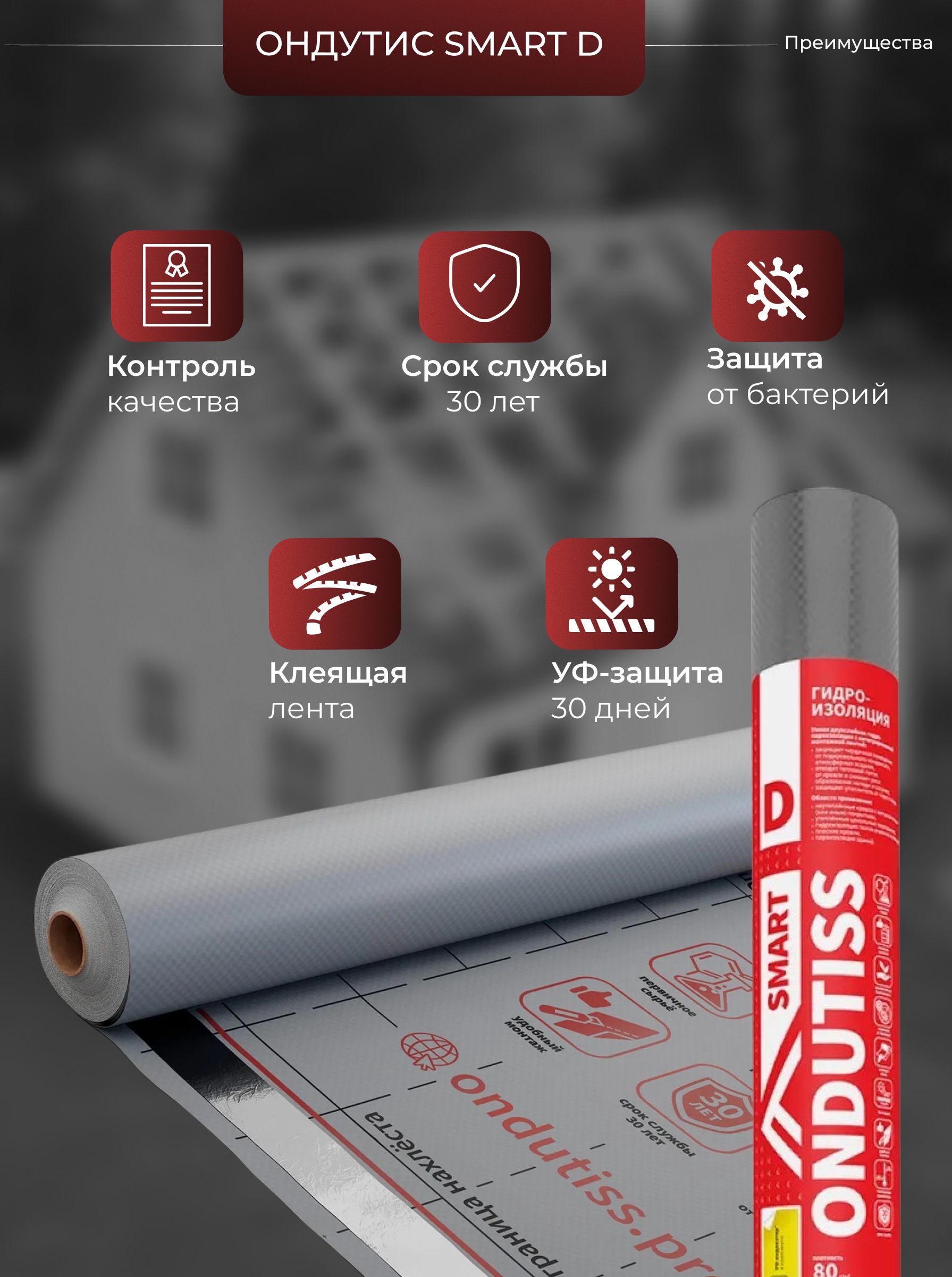 ONDUTISS SMART D - это высококачественная строительная гидроизоляционная пленка, предназначенная для защиты различных строительных объектов от влаги. Размеры пленки позволяют покрывать площадь до 70 м², что делает её идеальным решением как для крупных, так и для менее масштабных проектов.