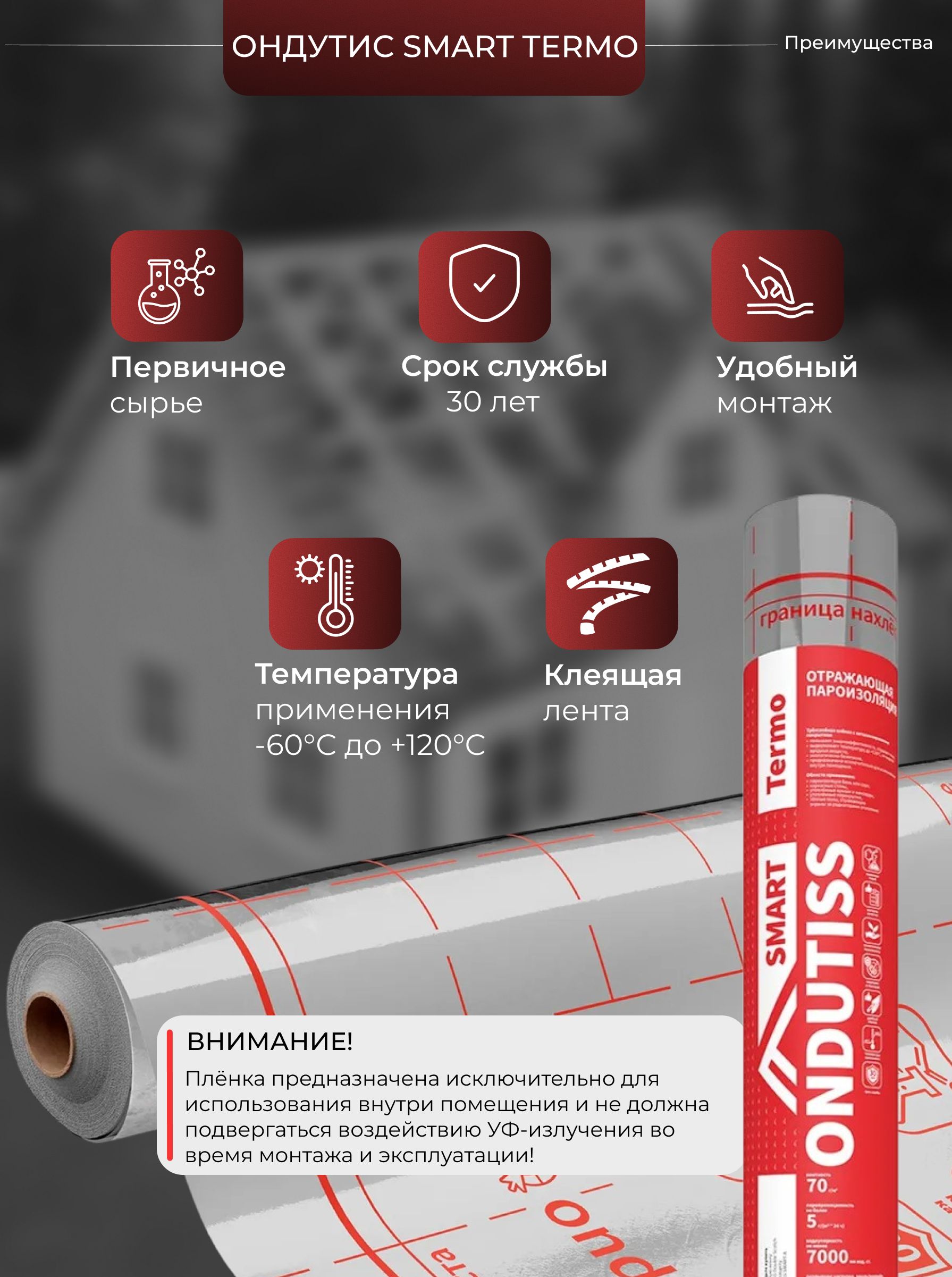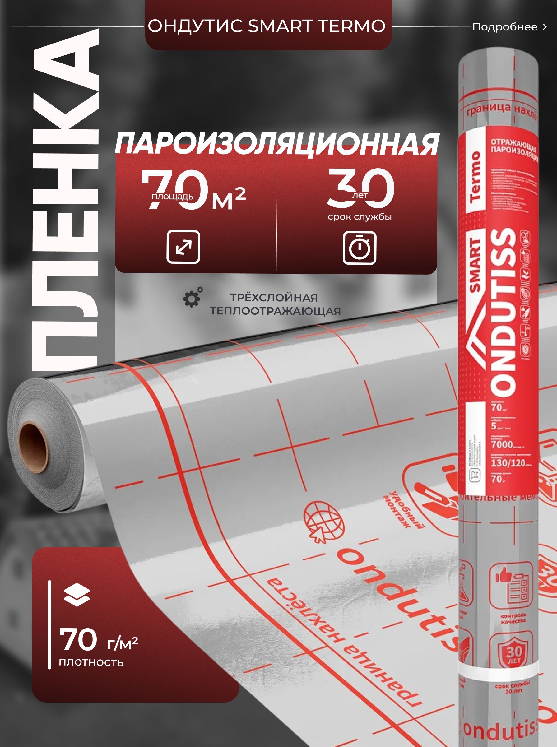 ONDUTISS SMART Termo – это высококачественная строительная пароизоляционная пленка, идеально подходящая для создания эффективной теплоизоляции в помещениях площадью до 70 квадратных метров. Этот продукт, обладая отражающими свойствами, помогает сохранить тепло внутри помещения, предотвращая его выход через стены и потолок.