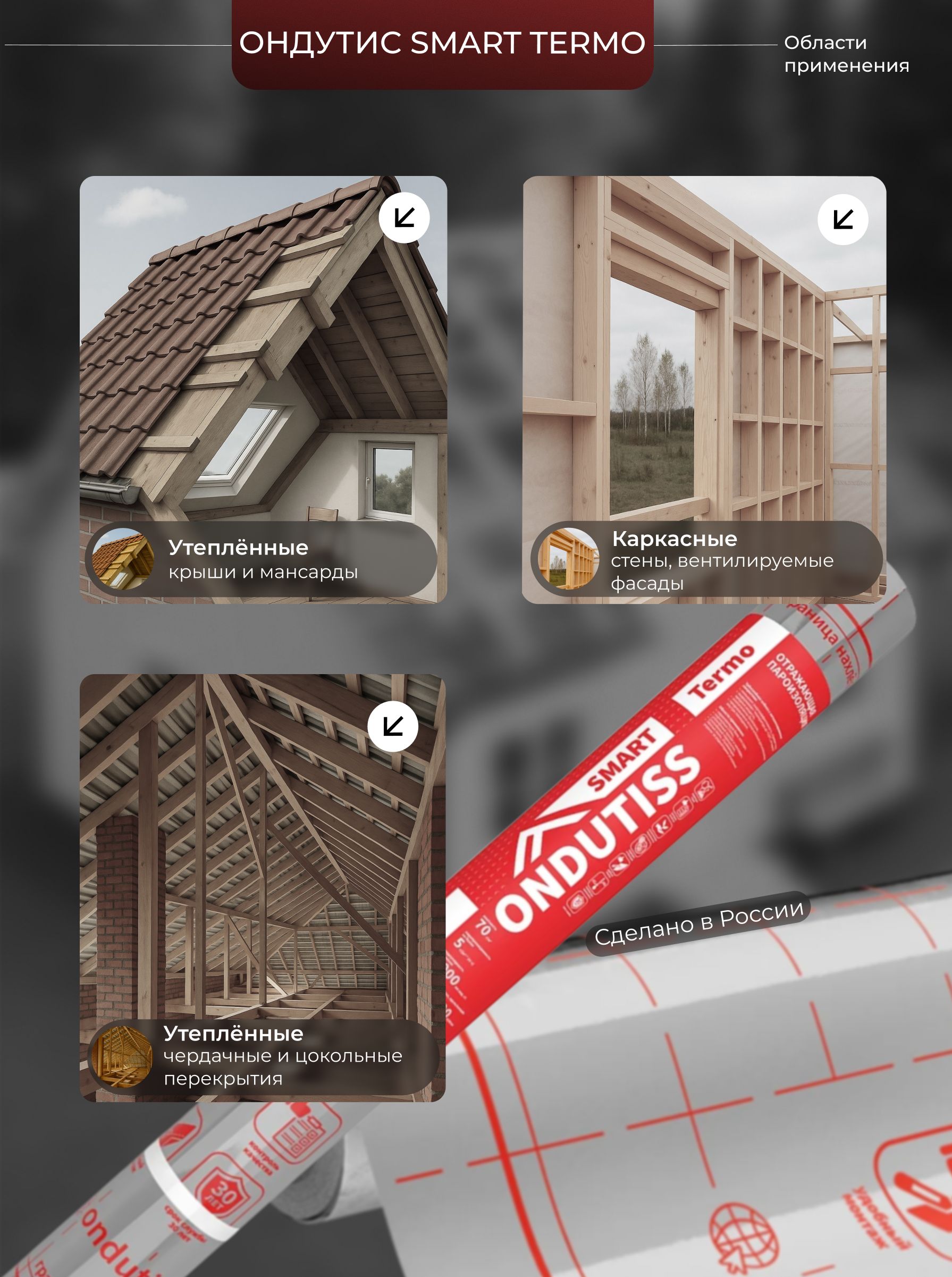 ONDUTISS SMART Termo легко укладывается и подходит для использования в разнообразных условиях, включая чердаки, подвалы и стены. Ее высокая прочность и стойкость к разным внешним воздействиям делают пленку отличным выбором для строительных работ, обеспечивая необходимую защиту и гарантируя комфортный микроклимат в помещении.