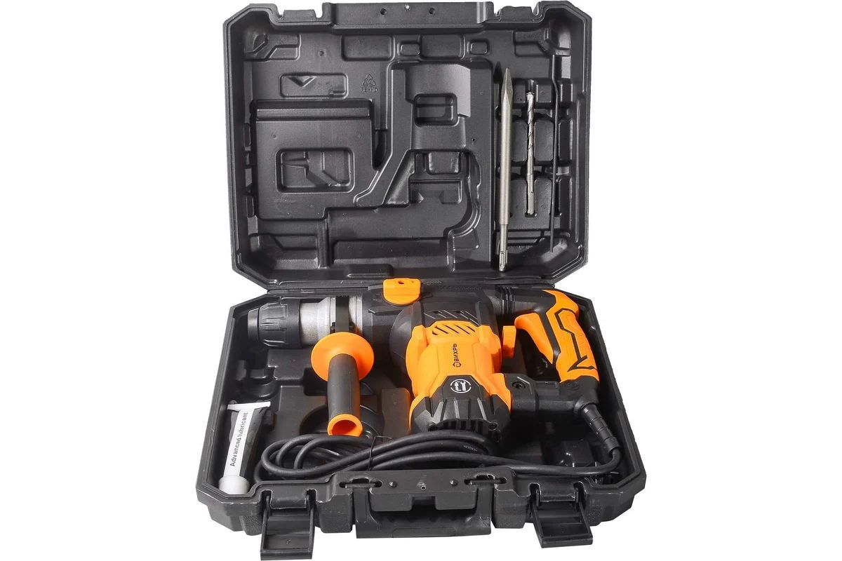 В комплект перфоратора входят ограничитель глубины сверления, кейс для хранения и переноски инструмента, дополнительная рукоятка и бур.