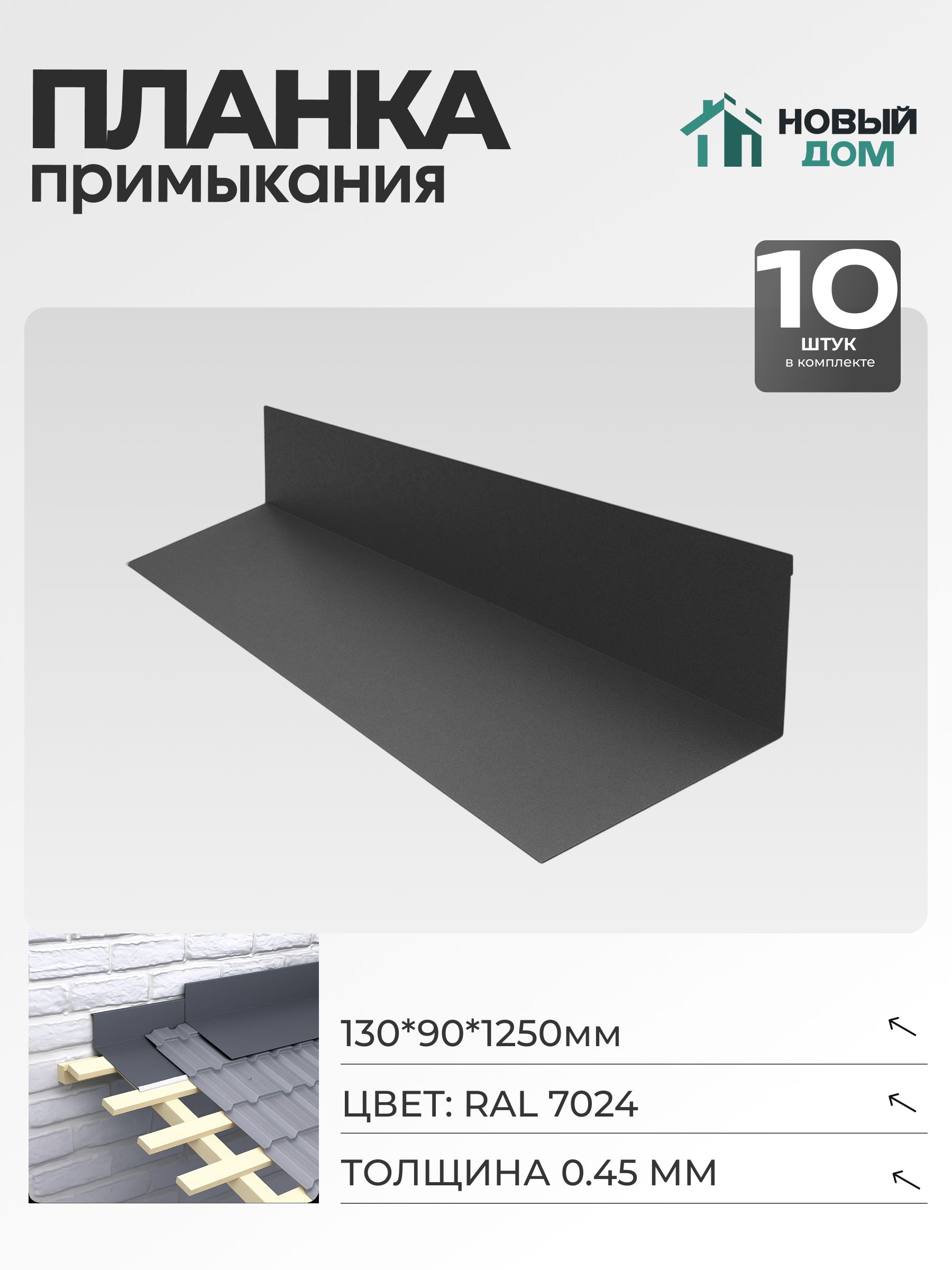 Планка примыкания 130х90 мм с длиной 1250 мм выполнена из прочного металла толщиной 0,45 мм. Изделие окрашено в серый цвет, соответствующий оттенку RAL 7024, что обеспечивает эстетичный внешний вид и защиту от коррозии. Удобный комплект состоит из 10 штук, что позволяет использовать материал для монтажа больших участков и обеспечивает необходимый запас для работы.Данная планка примыкания предназначена для защиты и герметизации примыканий различных конструкций, обеспечивая надежное соединение элементов. Стандартные размеры 130х90 мм удобны для использования в строительных и ремонтных работах, а длина 1250 мм позволяет легко адаптировать изделие под требуемые параметры.Материал обладает устойчивостью к внешним воздействиям, что важно для долговечности и сохранения функциональных характеристик во время эксплуатации. Серый оттенок (RAL 7024) гармонично вписывается в разнообразные архитектурные решения и минимизирует визуальное воздействие на общую композицию объекта.В комплекте 10 штук, что значительно упрощает процесс монтажа и снижает необходимость дополнительных заказов. Толщина 0,45 мм обеспечивает достаточную жесткость при сохранении удобства обработки и установки под различные углы и формы поверхностей. Изделие отлично подходит для использования в сочетании с другими отделочными материалами, улучшая гидроизоляционные и эксплуатационные характеристики стыков.Комплектная поставка включает планки с точными размерами, что облегчает планирование работ и позволяет минимизировать отходы. Такой подход повышает эффективность монтажа и снижает временные затраты. Серый цвет (RAL 7024) позволяет сохранять привлекательный внешний вид и придает завершенность конструкции.Планка примыкания 130х90 мм длиной 1250 мм с толщиной 0,45 мм будет надежным элементом при выполнении ремонтных и строительных процессов, где важна устойчивость к атмосферным влияниям и эстетика.