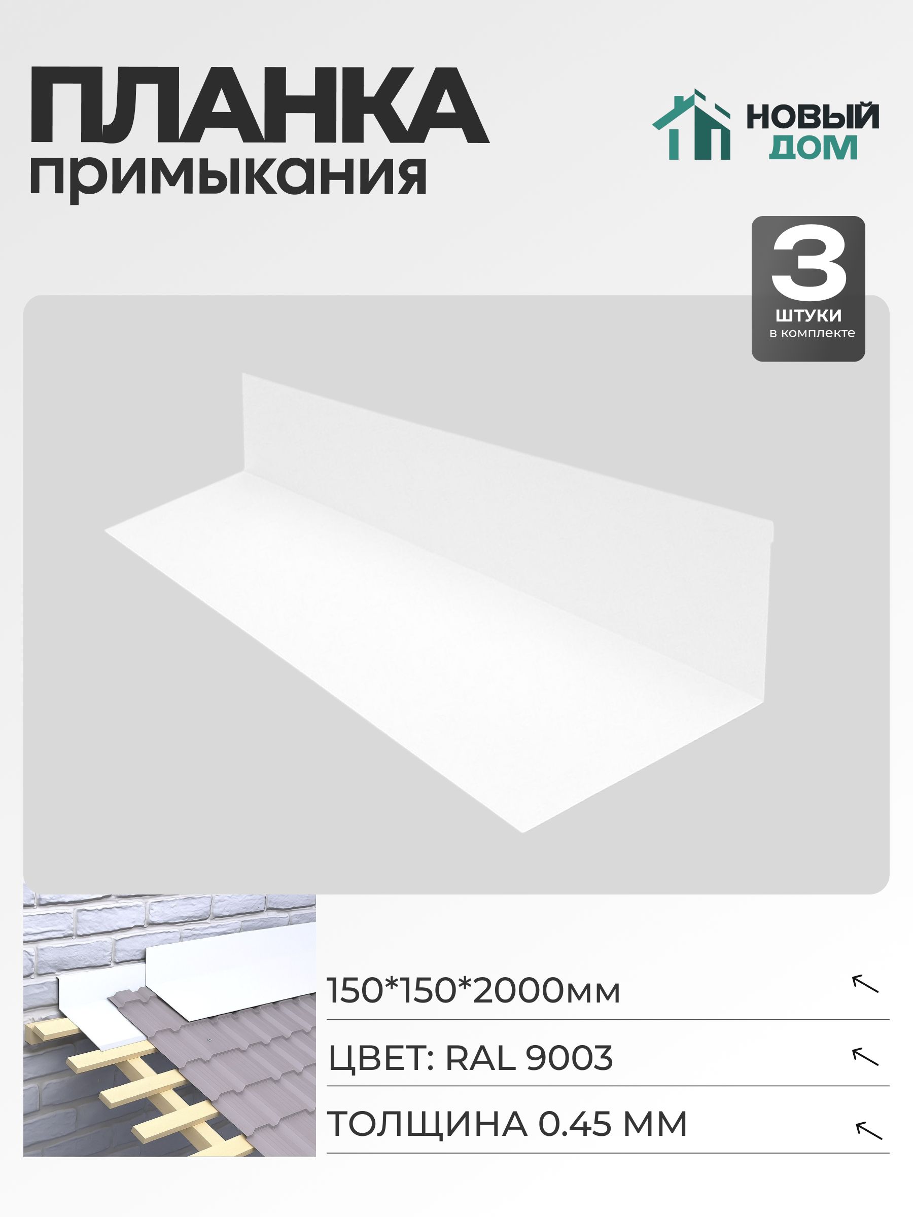 Планка примыкания 150х150мм — это элемент, который используется для оформления соединения разных поверхностей и защиты стыков от проникновения влаги, пыли и образования щелей. Изделие имеет продуманную форму, что обеспечивает его плотное прилегание и удобство монтажа при любых отделочных и кровельных работах. Длина каждой планки составляет 2000мм, что позволяет использовать ее для закрытия значительных участков примыканий с минимальным количеством стыков и гарантирует аккуратный внешний вид готовой конструкции.Цвет исполнения — белый (RAL9003), он подходит для большинства современных отделочных решений и гармонирует с разными оттенками фасадных и кровельных материалов. Такой белый цвет помогает создать аккуратное и современное оформление строительных объектов, не теряет насыщенности под воздействием солнца и не выгорает со временем. Защищенное покрытие дополнительно предохраняет поверхность от образования ржавчины и других внешних воздействий, сохраняя внешний вид изделия на долгий срок эксплуатации.Толщина каждой планки — 0,45мм, что является оптимальным выбором для обеспечения необходимой прочности и стойкости к механическим повреждениям. Такой показатель гарантирует, что изделие сохраняет свою форму даже при перепадах температуры или под действием сильного ветра. Продукт не склонен к деформации или растрескиванию, рассчитан на длительный срок службы при минимальном уходе. Легкость материала существенно упрощает монтаж, не увеличивает нагрузку на конструкцию и облегчает транспортировку.В комплекте предоставляется 3 шт., что дает возможность выполнить работы на объектах различной площади и конфигурации без необходимости приобретать дополнительные изделия. Такой подход удобно использовать одновременно на нескольких участках или для одного крупного объекта, минимизируя затраты времени и средств. Каждый комплект позволяет реализовать задачи по защите и оформлению стыков, как при первичном строительстве, так и при ремонте зданий.