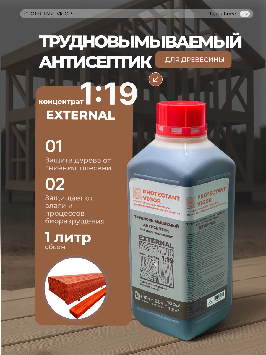 PROTECTANT Vigor EXTERNAL - это трудновымываемый антисептик-консервант, предназначенный для наружных работ. Он обеспечивает надежную защиту древесины от плесени, износа и влаги, что делает его незаменимым помощником для тех, кто заботится о долговечности своих деревянных конструкций.