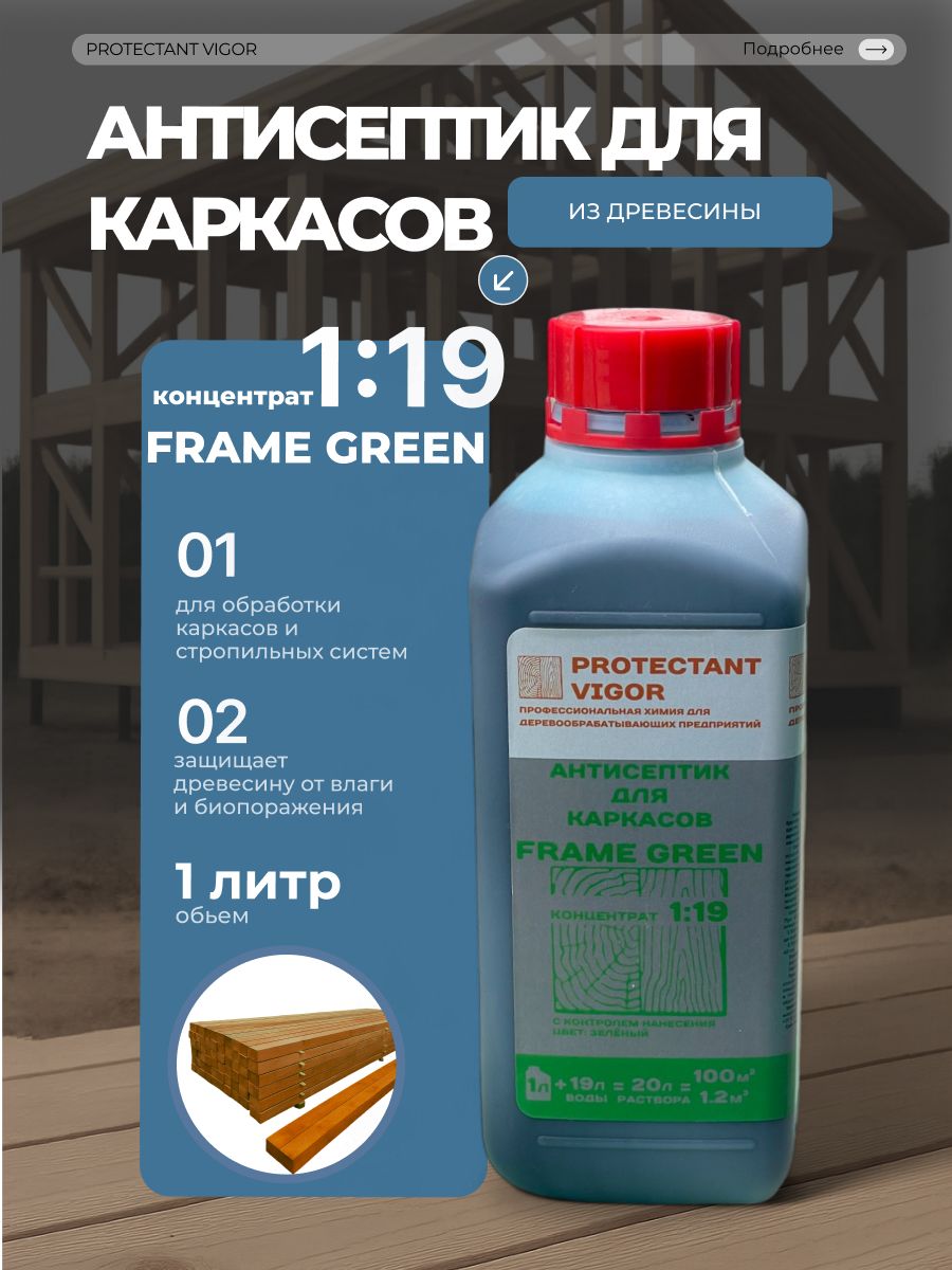 Выбирая PROTECTANT Vigor Frame Green, вы получаете надежный и эффективный антисептик для защиты деревянных каркасов от плесени, износа и влаги.