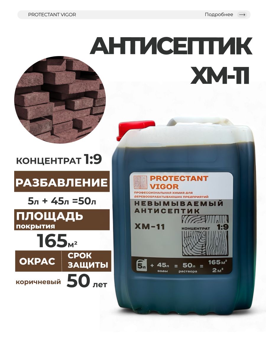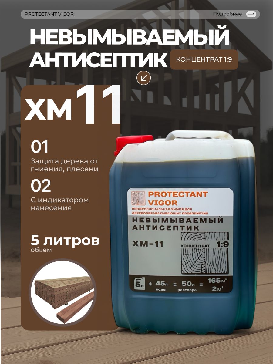 PROTECTANT Vigor ХМ-11 - это концентрат невымываемого антисептика, предназначенный для обработки деревянных поверхностей. Он обеспечивает надежную защиту от гниения, плесени и других биологических угроз, сохраняя при этом естественный вид древесины.