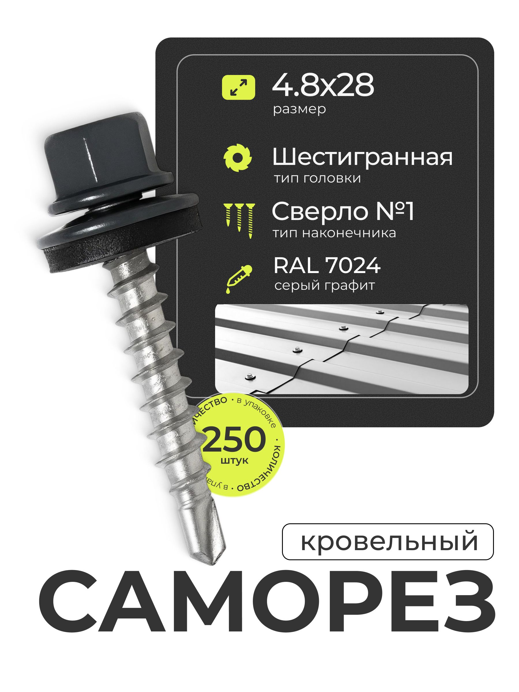 Прочный оцинкованный крепёж диаметром 4,8 мм и длиной 28 мм обеспечивает надёжное соединение металлических поверхностей, профильных труб и поликарбоната. Темно-серое антикоррозийное покрытие выдерживает агрессивные условия эксплуатации. Металлическая головка с шестигранным шлицем позволяет равномерно распределить усилие во время завинчивания. Комплект включает 250 элементов с готовыми свёрловыми наконечниками и пресс-шайбами для плотного закрепления материалов.
