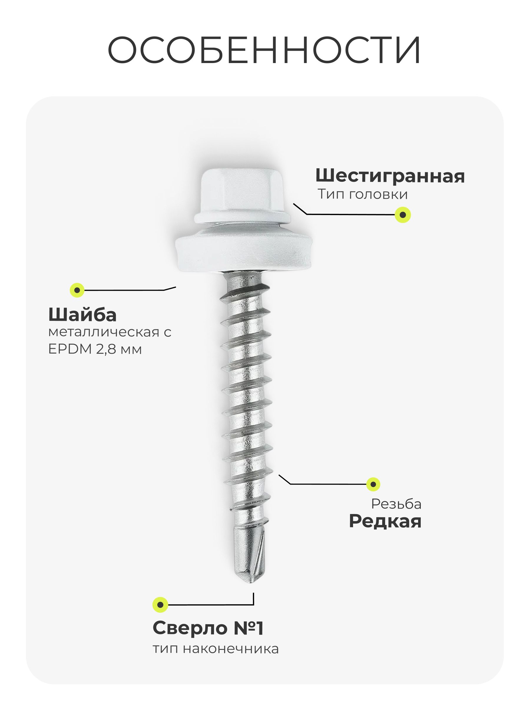 Сверловая головка и шестигранная форма позволяют легко завинчивать саморез даже в плотные материалы, а пресс-шайба исключает деформацию поверхности при монтаже.