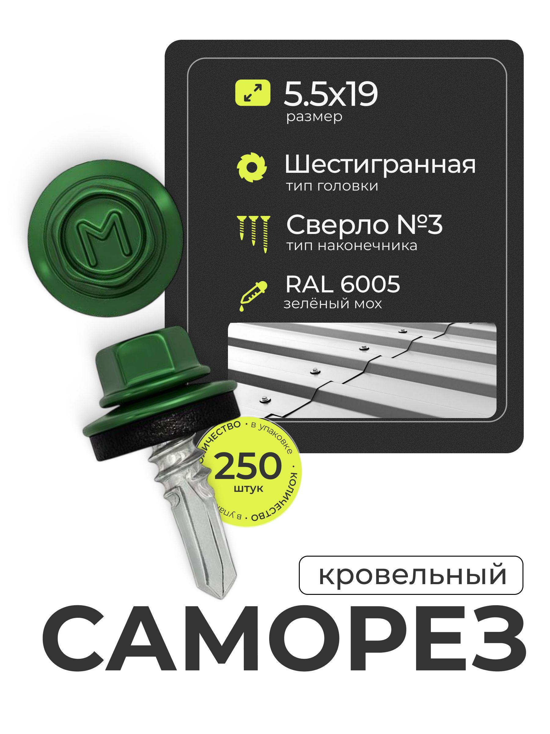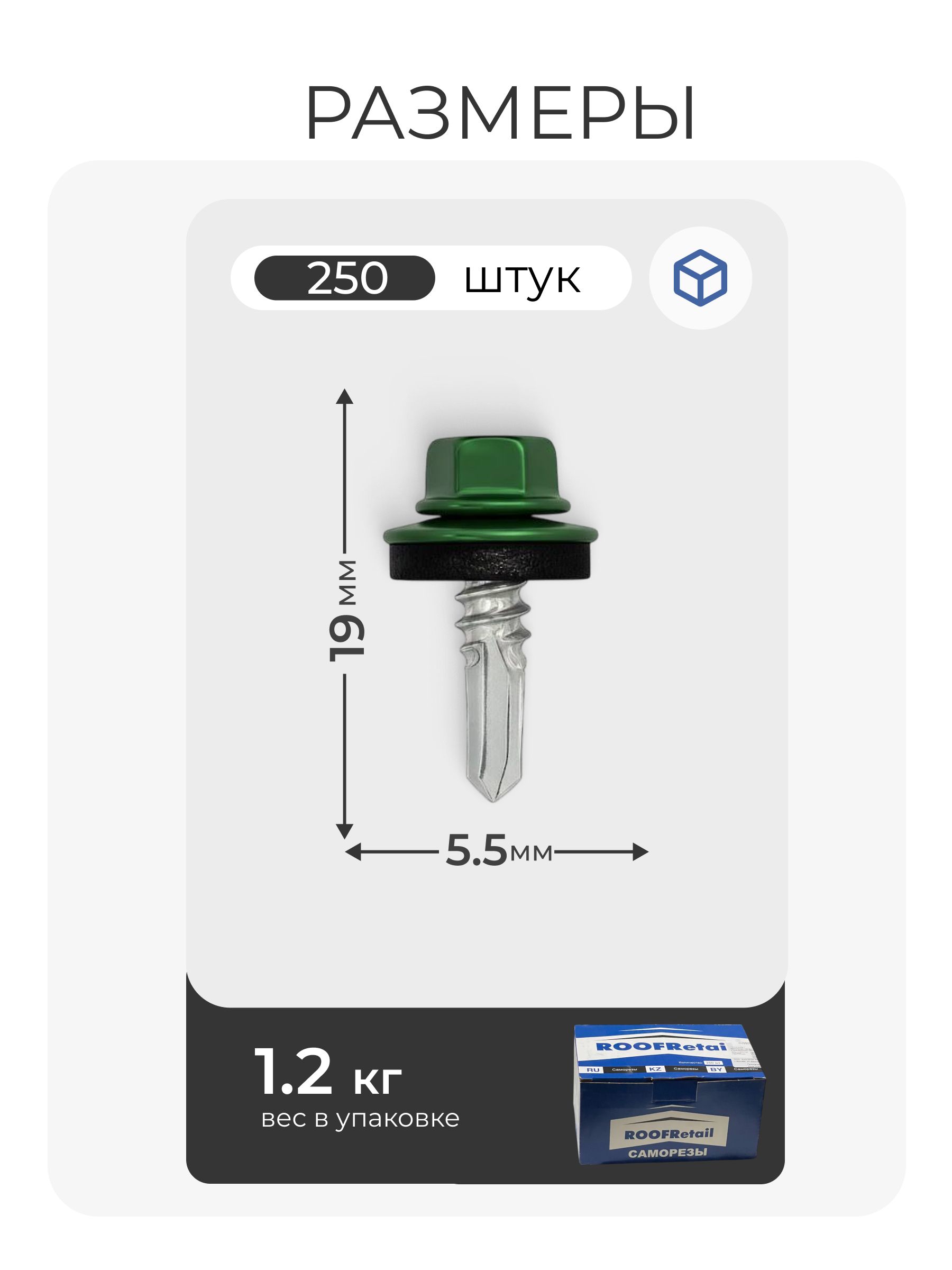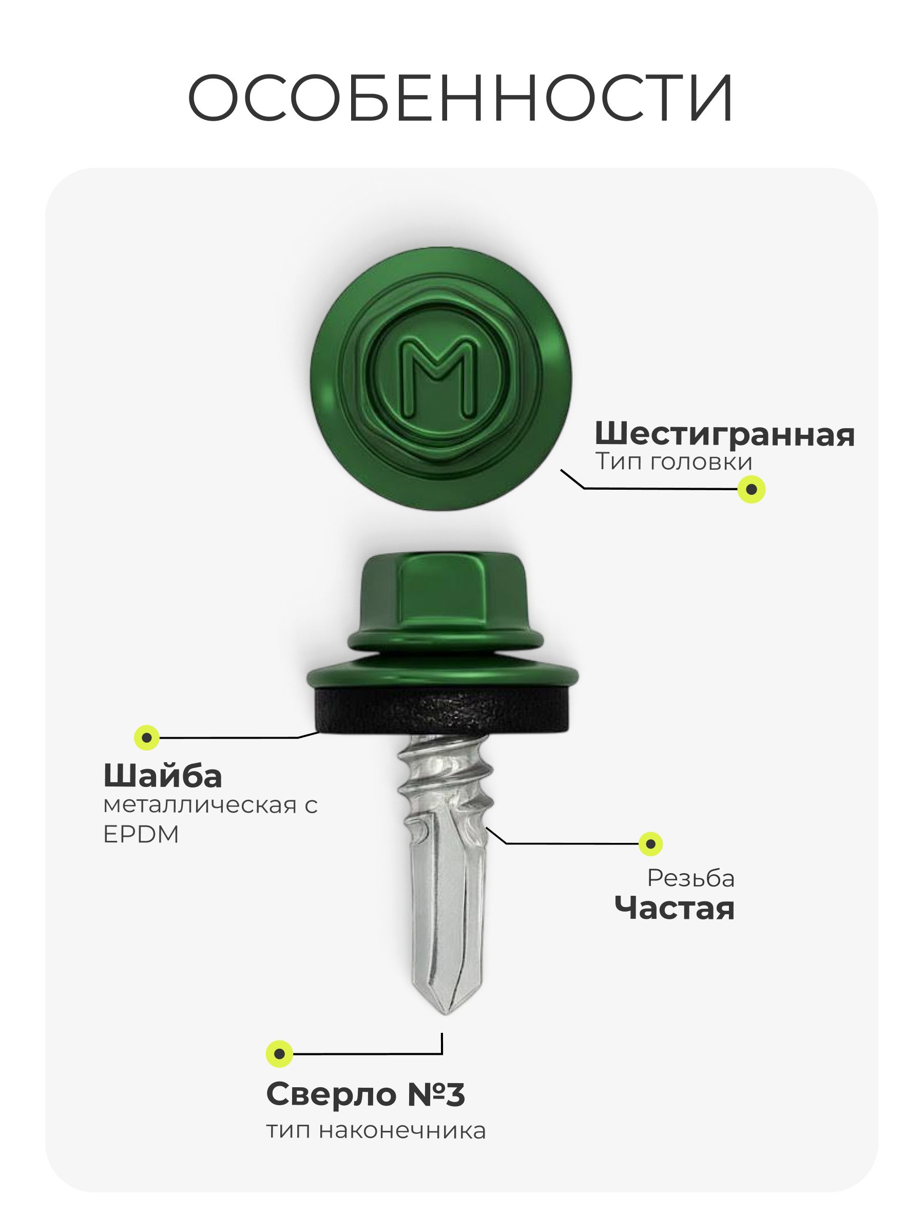 Эти саморезы идеально подходят для монтажа металлических конструкций, профилей и поликарбоната благодаря цинковому покрытию, обеспечивающему защиту от коррозии даже во влажном климате. Темно-зеленый окрас гармонично сочетается с современными кровельными материалами, минимизируя видимость крепежа. Комплект из 250 штук в одной упаковке экономит время на повторную закупку.