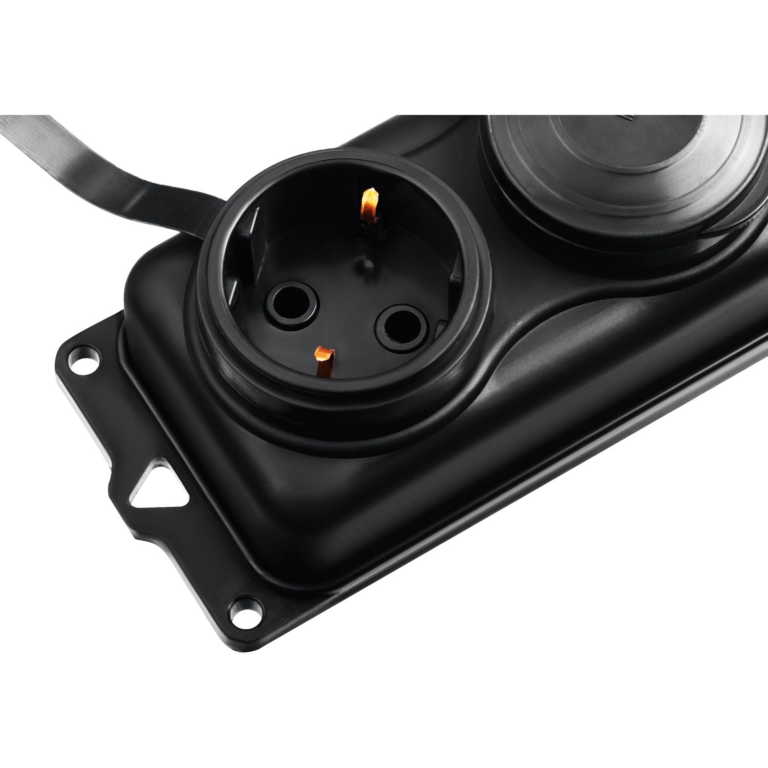 Удлинитель оснащен тремя розетками с крышками, что обеспечивает дополнительную безопасность и защиту от пыли и влаги. Розетки расположены на рамке, что делает их более устойчивыми к механическим воздействиям.