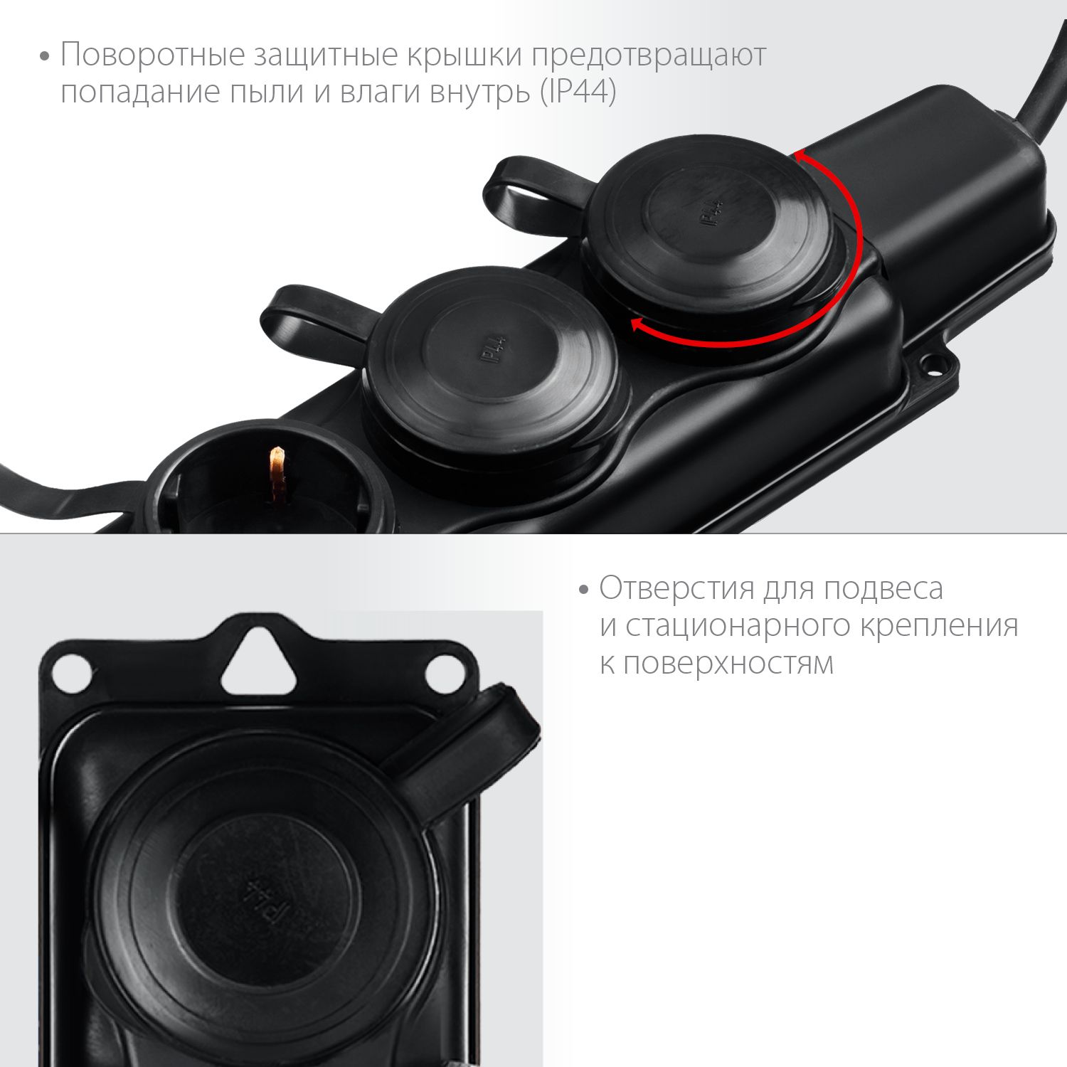 Степень защиты IP44 гарантирует защиту от брызг воды и пыли, что делает удлинитель надежным и долговечным. Это позволяет использовать его в различных условиях, включая работу на улице или в помещениях с повышенной влажностью.