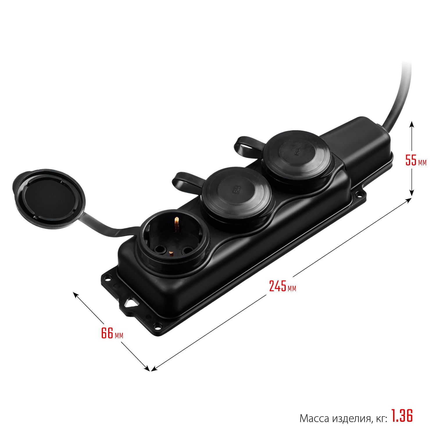 Удлинитель оснащен тремя розетками, что позволяет одновременно подключать несколько устройств. Это особенно удобно при работе с электроинструментом, где требуется одновременное использование нескольких устройств.