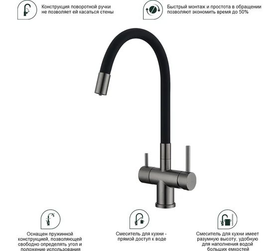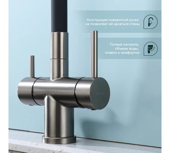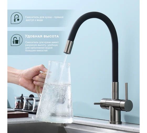 Подключение к системе очистки воды осуществляется через специальный переходник, что позволяет получать качественную питьевую воду прямо из крана. Комплектация включает керамический картридж, аэратор, гибкую подводку длиной 50 см и все элементы для быстрой установки на раковину без лишних усилий.