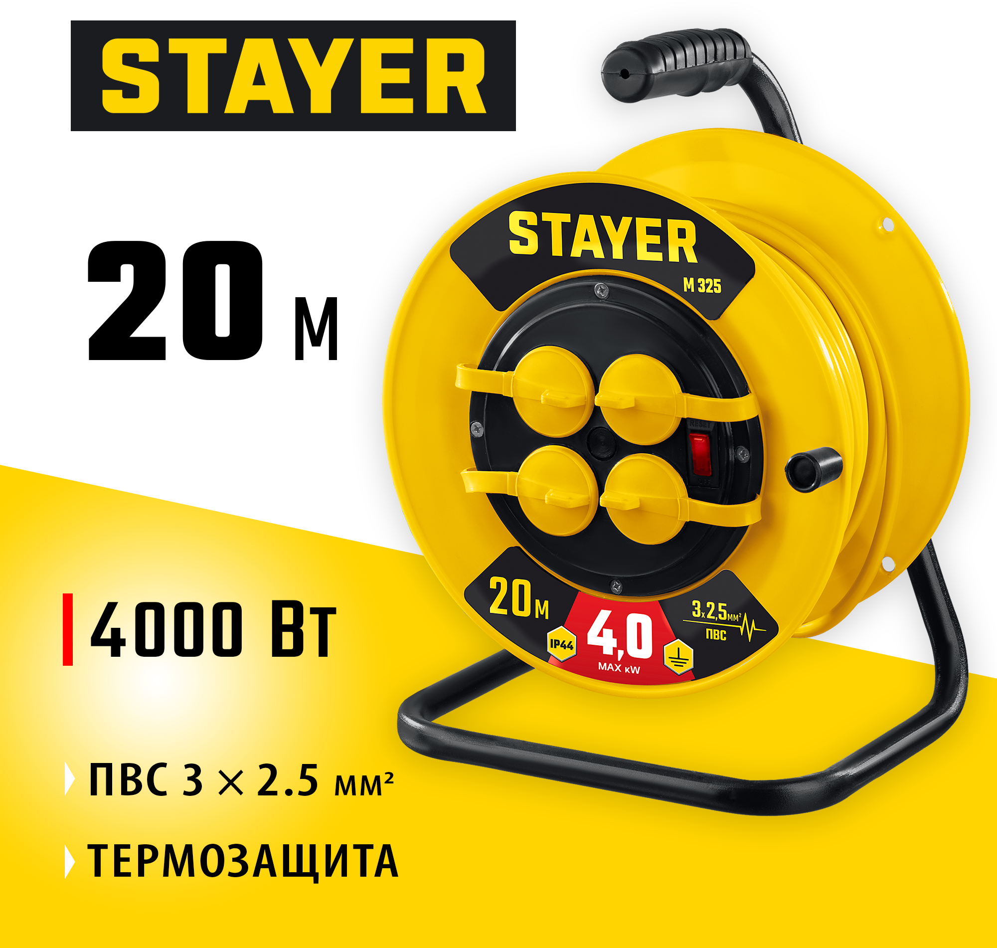 Удлинитель STAYER М-325 на катушке - это надежное и функциональное решение для подключения бытовых электрических приборов на небольшом расстоянии от питающей сети.