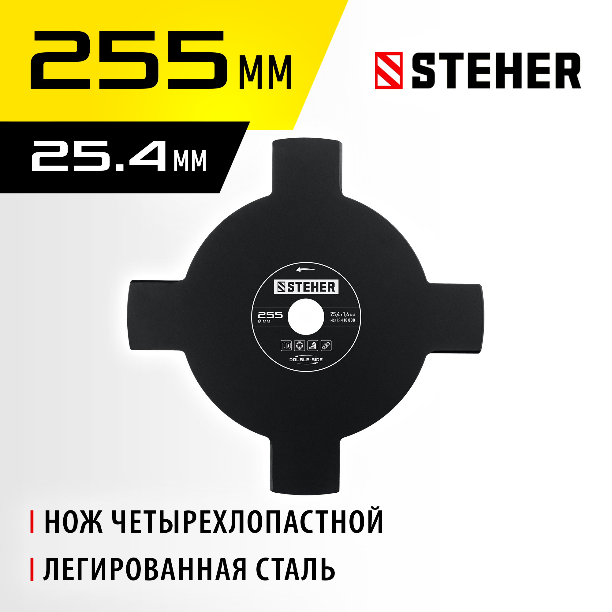 Нож четырехлопастной STEHER - эффективный инструмент для кошения даже грубой растительности на садовом участке. Качественный материал гарантирует увеличенный ресурс, а специальная заточка - легкий рез