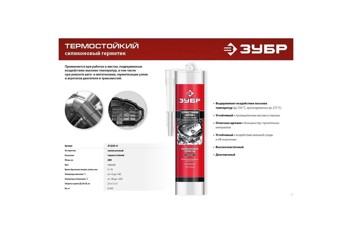 Термостойкий силиконовый герметик ЗУБР МОТОР - это надежный и удобный в использовании продукт, который станет незаменимым помощником в решении различных задач по герметизации и защите поверхностей от высоких температур.