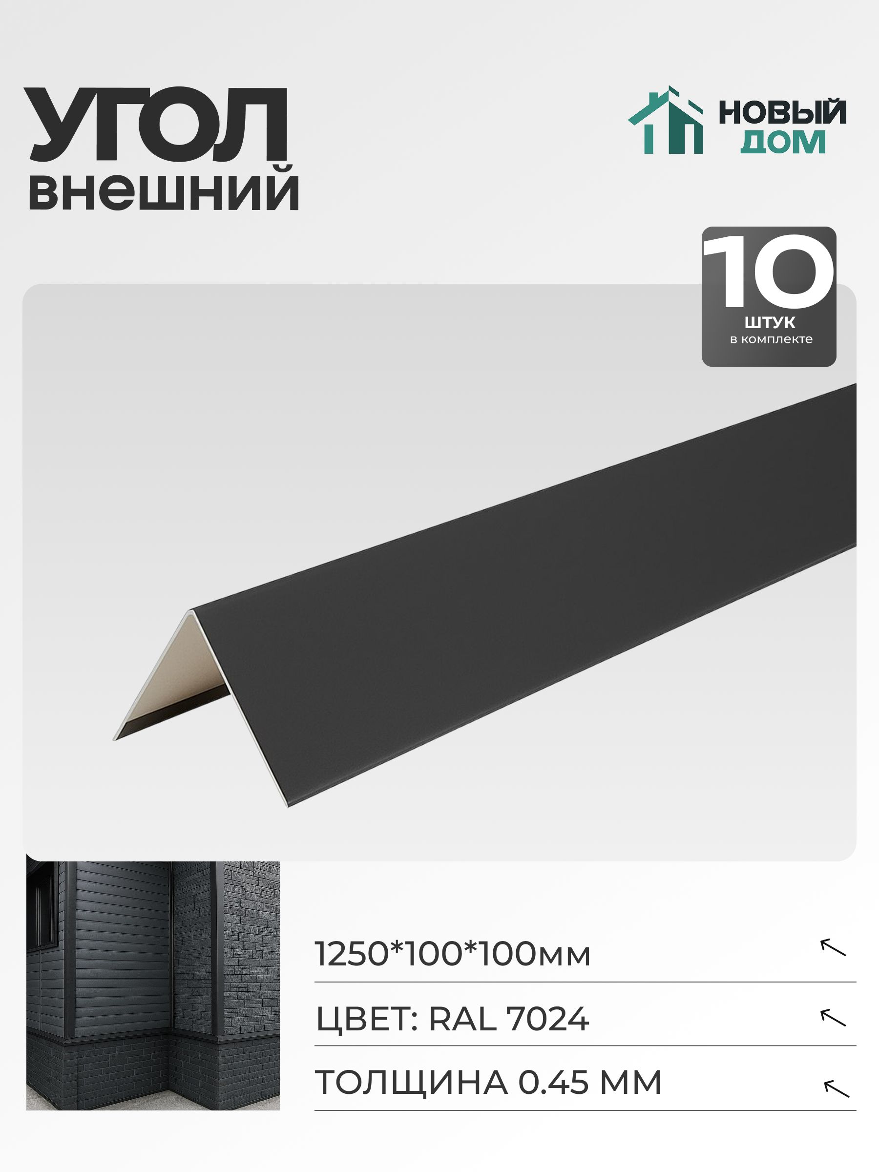 Угол внешний имеет размеры 10х10 см и серый цвет (RAL 7024), что позволяет ему гармонично вписываться в любой экстерьер.