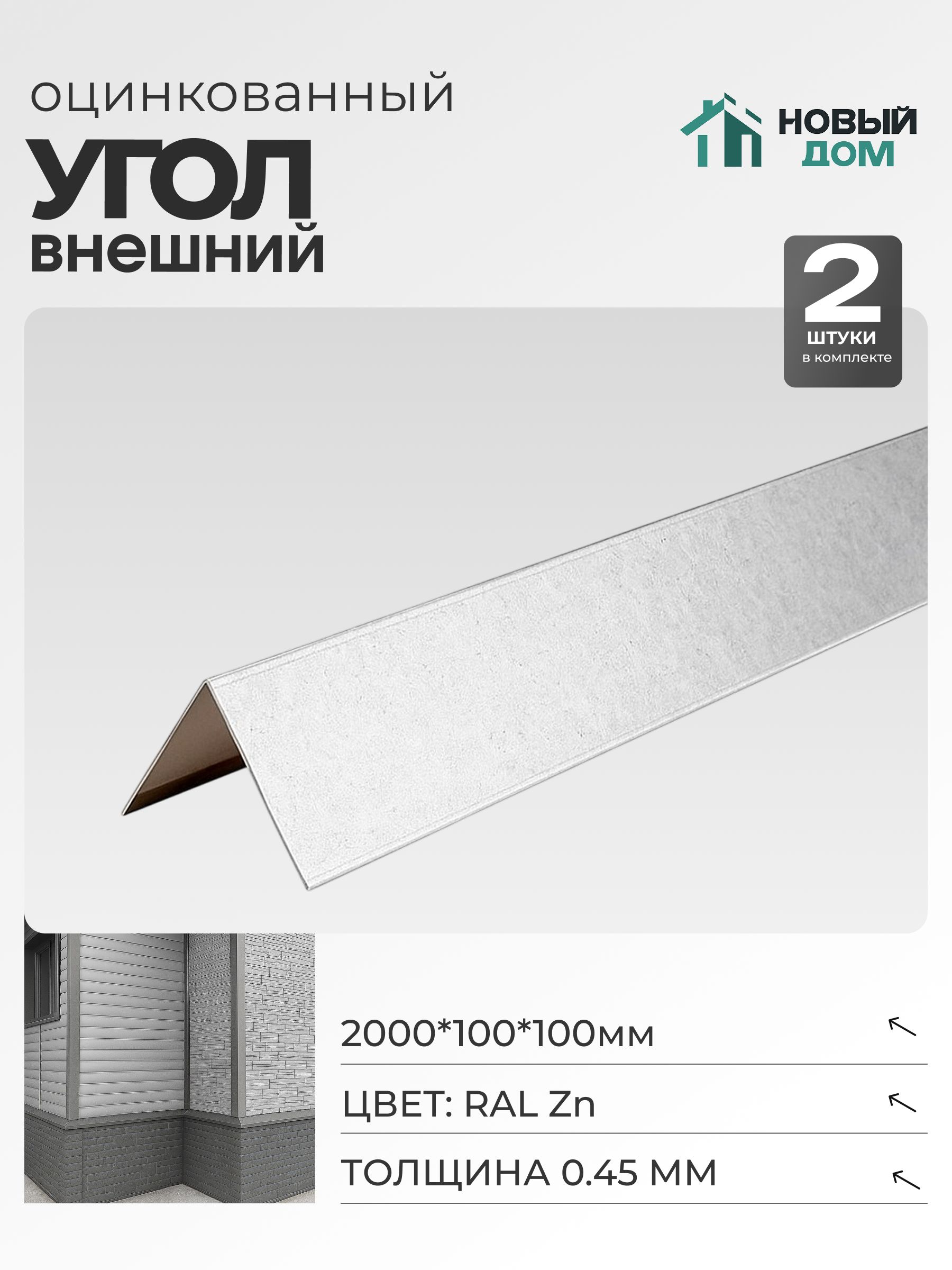 Изготовлен из оцинкованной стали толщиной 0,45 мм, что обеспечивает прочность и долговечность изделия. Оцинкованное покрытие защищает материал от коррозии и увеличивает срок службы угла.