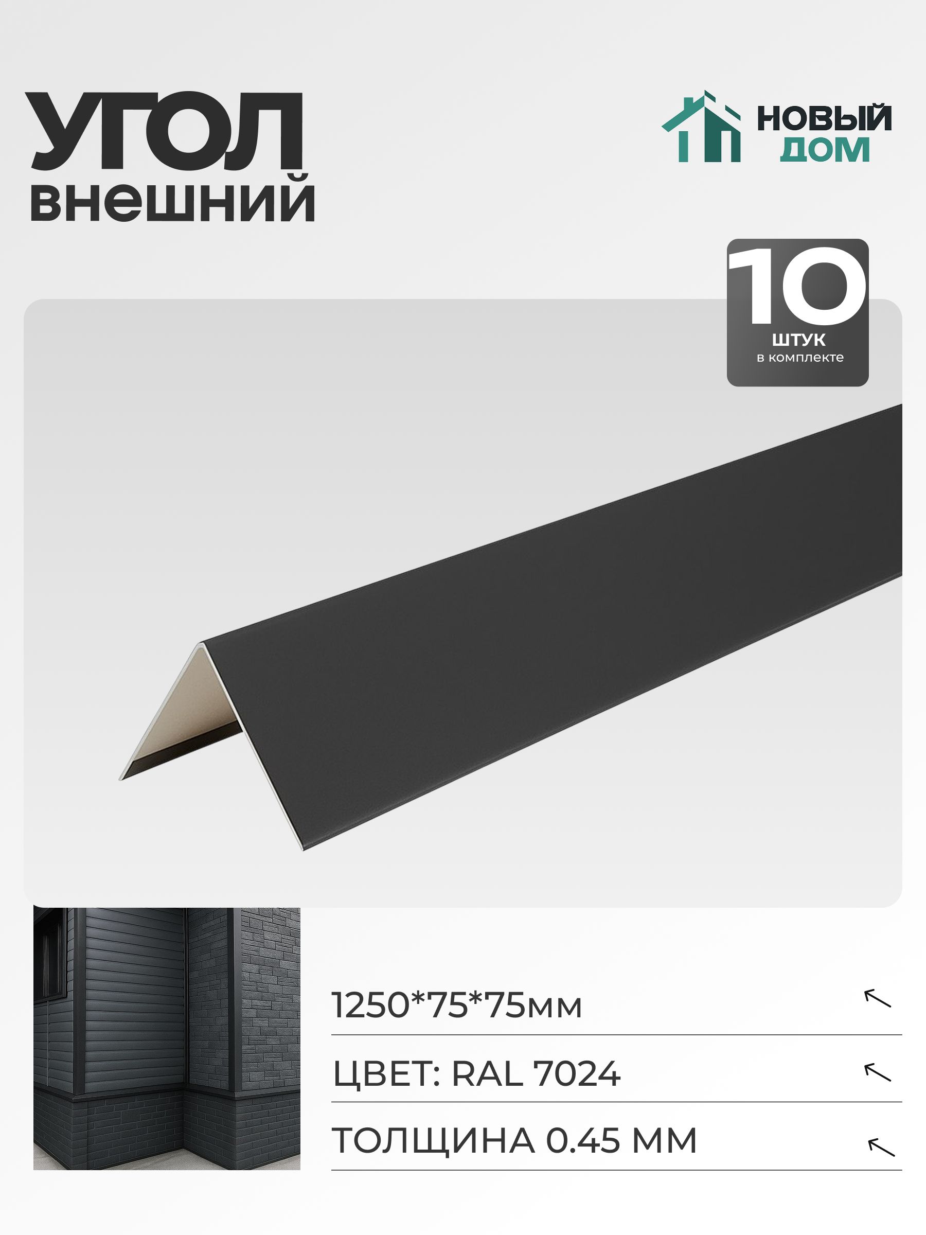 Угол внешний 75х75мм длиной 1250мм - это надежный элемент водостока, который станет незаменимым помощником в обустройстве кровли. Изготовлен из оцинкованной стали с полимерным покрытием толщиной 0,45мм, что обеспечивает его долговечность и устойчивость к коррозии.