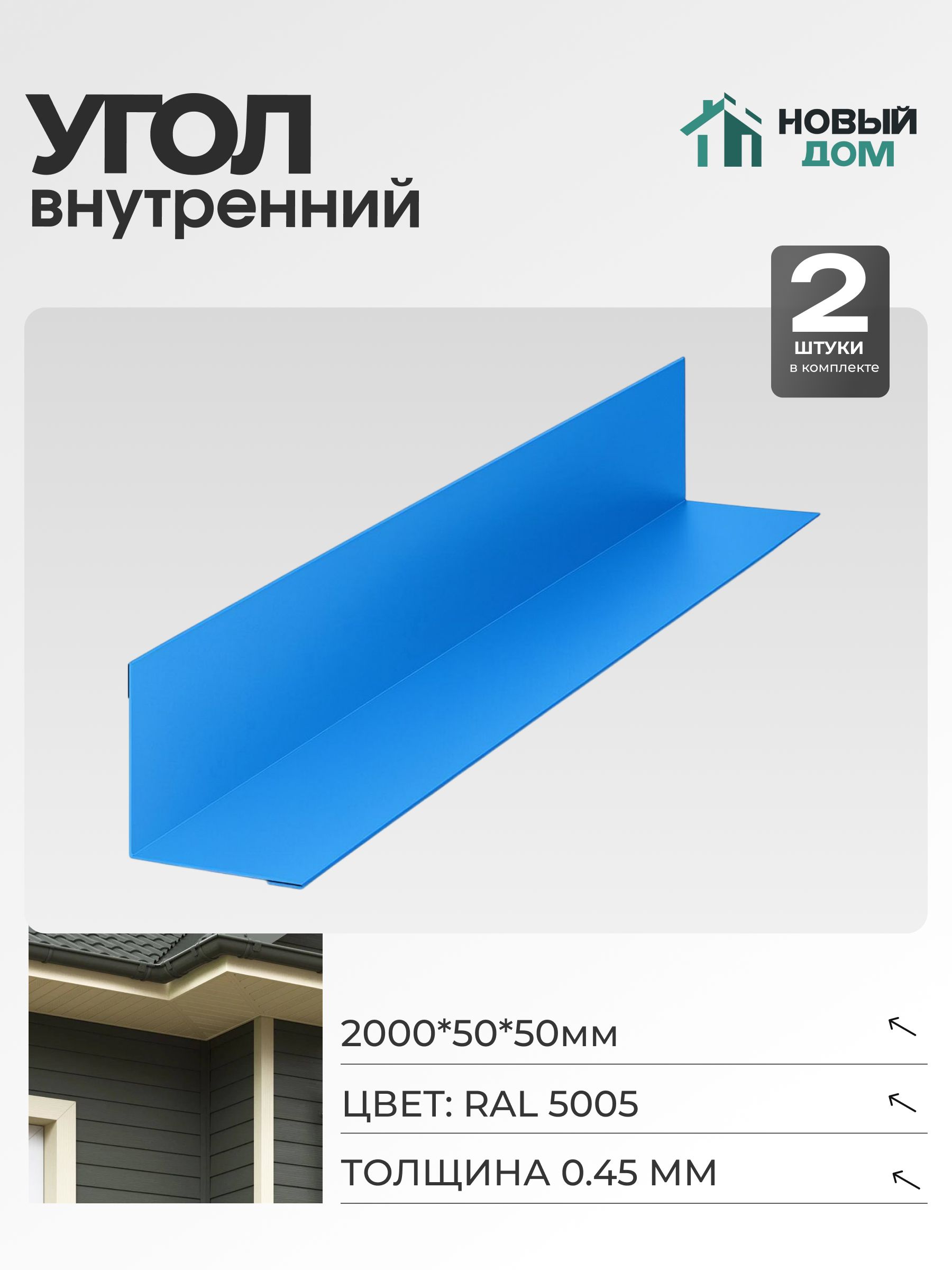 Угол внутренний 50х50мм Длина 2000мм, Синий (RAL 5005), 0,45мм, комплект 2 шт.