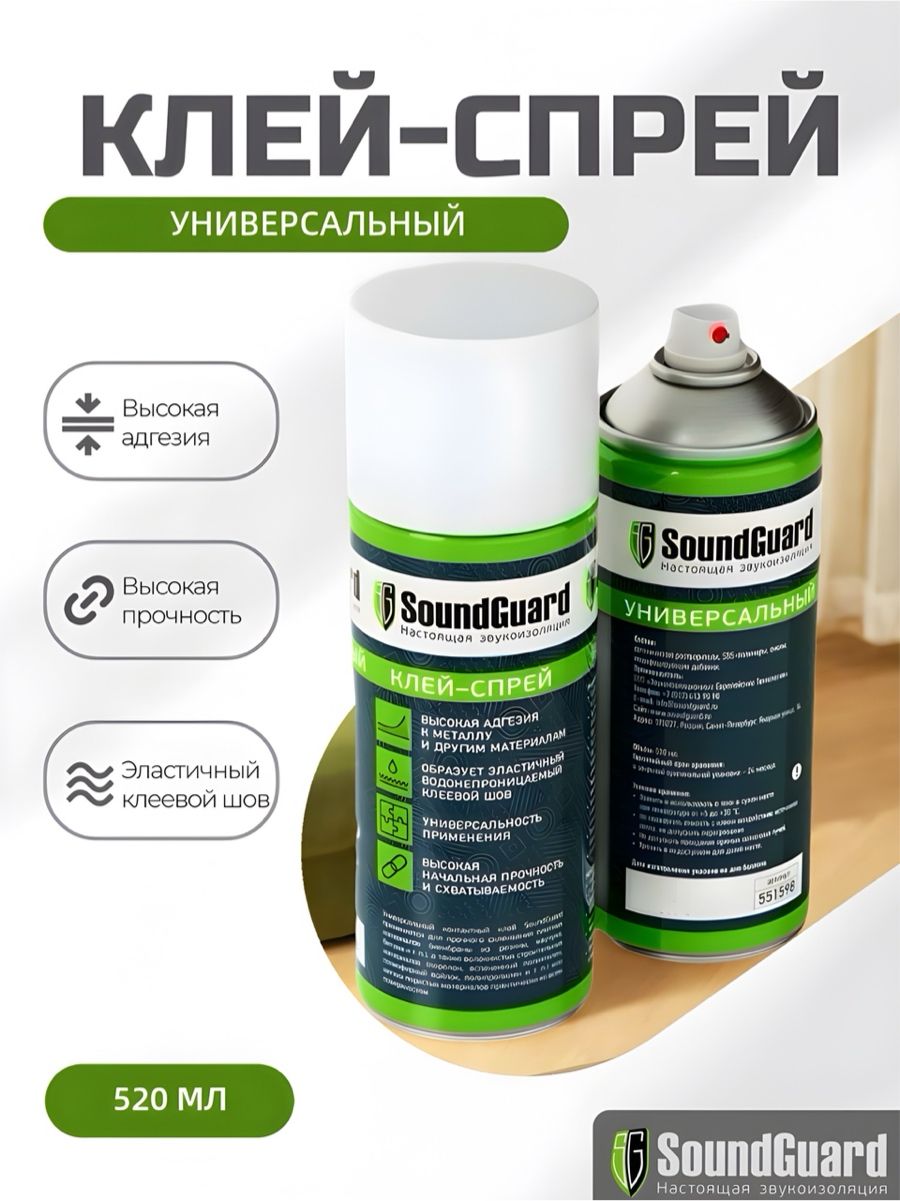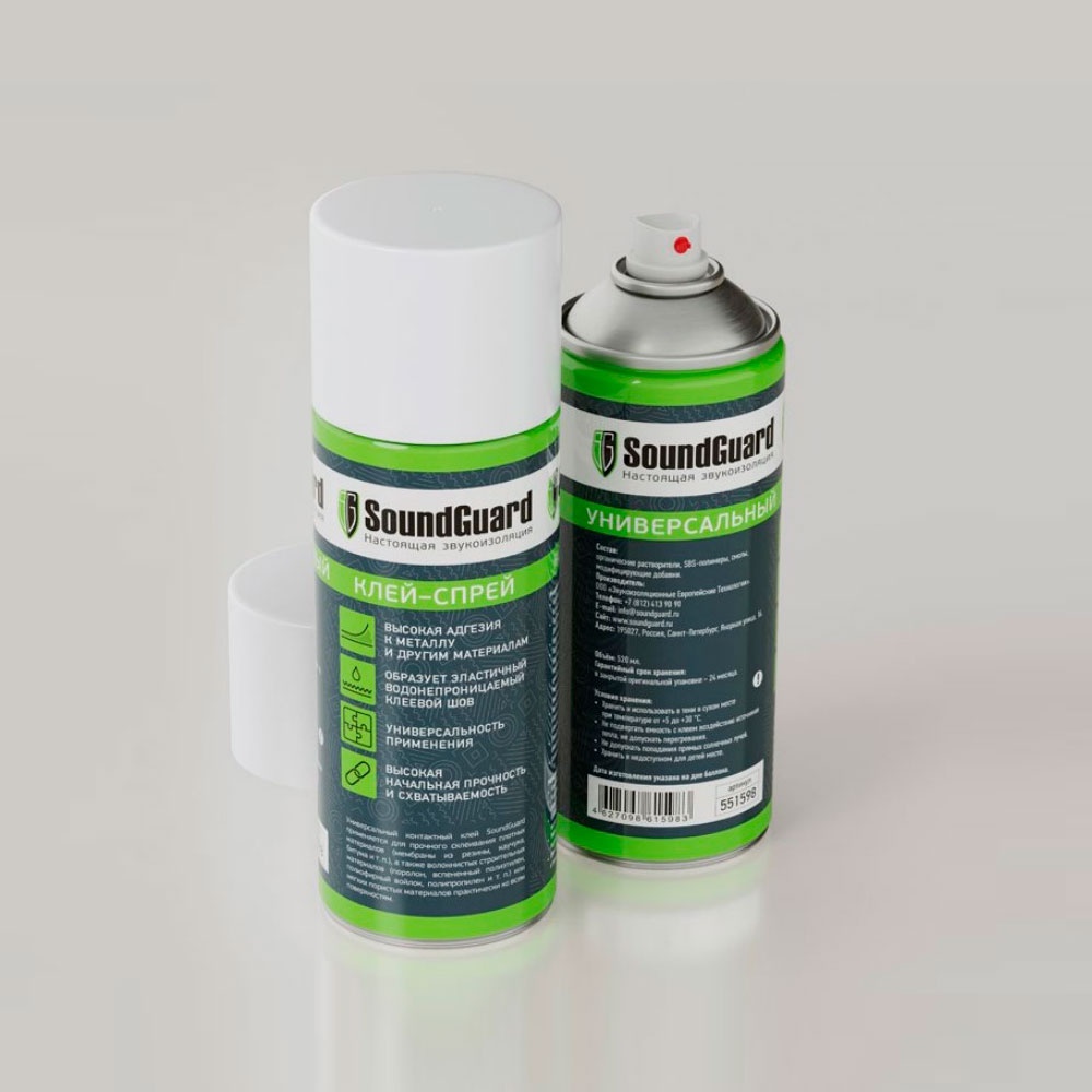 Клей–спрей для звукоизоляции SoundGuard (551598)- разработан специально для склеивания различных материалов, включая дерево, металл, пластик, стекло и другие.