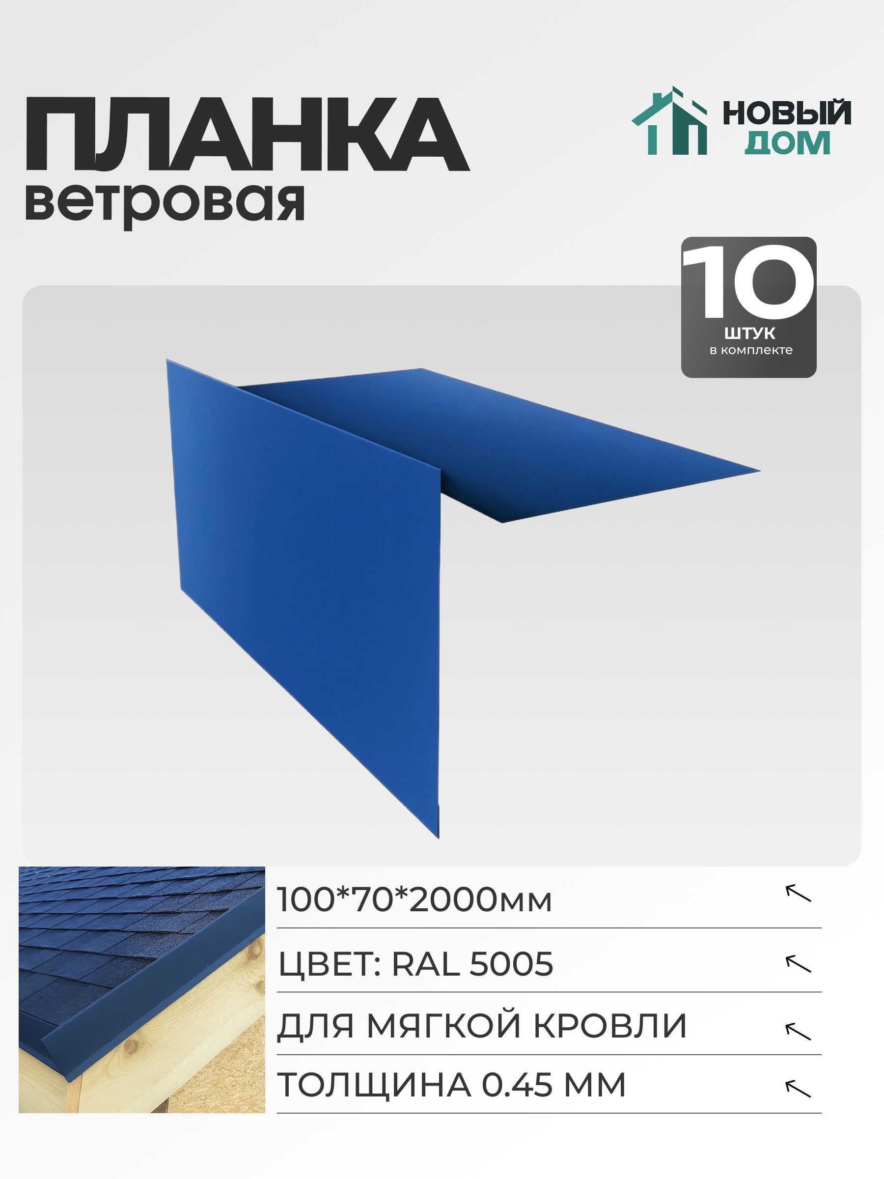 Ветровая планка (торцевая планка), для М/К 100х70мм, Длина 2000мм, Комплект 10шт, Синий (RAL 5005), 0,45мм – это изделие, предназначенное для использования в различных строительных и монтажных работах. Надежная ветровая планка обеспечивает дополнительную защиту кровельных конструкций и элементов фасада, предотвращая попадание влаги, пыли и ветра под отделочные материалы. Благодаря своей конструкции, ветровая планка (торцевая планка) подходит для установки на разные участки, где требуется усиленная фиксация и герметизация стыков.Изделие разработано специально для М/К 100х70мм и обеспечивает оптимальное прилегание к соответствующему профилю, снижая риск образования зазоров и щелей. Длина 2000мм делает планку удобной для монтажа на протяженных участках, сокращая количество стыков, что благоприятно сказывается на долговечности всей конструкции. Толщина 0,45мм поддерживает прочность и одновременно остается достаточно легкой, что удобно при транспортировке и монтаже. Комплект рассчитан на 10шт, что позволяет закрывать большие площади, обеспечивая единый стандарт качества по всему периметру объекта.Планка обеспечена надежным покрытием, соответствующим цвету синий (RAL 5005), благодаря чему изделие легко комбинируется с большинством современных кровель и металлических профилей. Такое цветовое решение гармонирует с различными стилями строений, подходит для как жилых, так и промышленных зданий. Поверхность ветровой планки устойчива к выгоранию, воздействию осадков и существенных перепадов температуры.Главное назначение изделия – долговременная защита торцевых участков конструкции от влаги, ветра и возможного разрушения под влиянием атмосферных факторов. Это позволяет поддерживать эксплуатационные характеристики кровельных и фасадных материалов на протяжении всего срока службы.