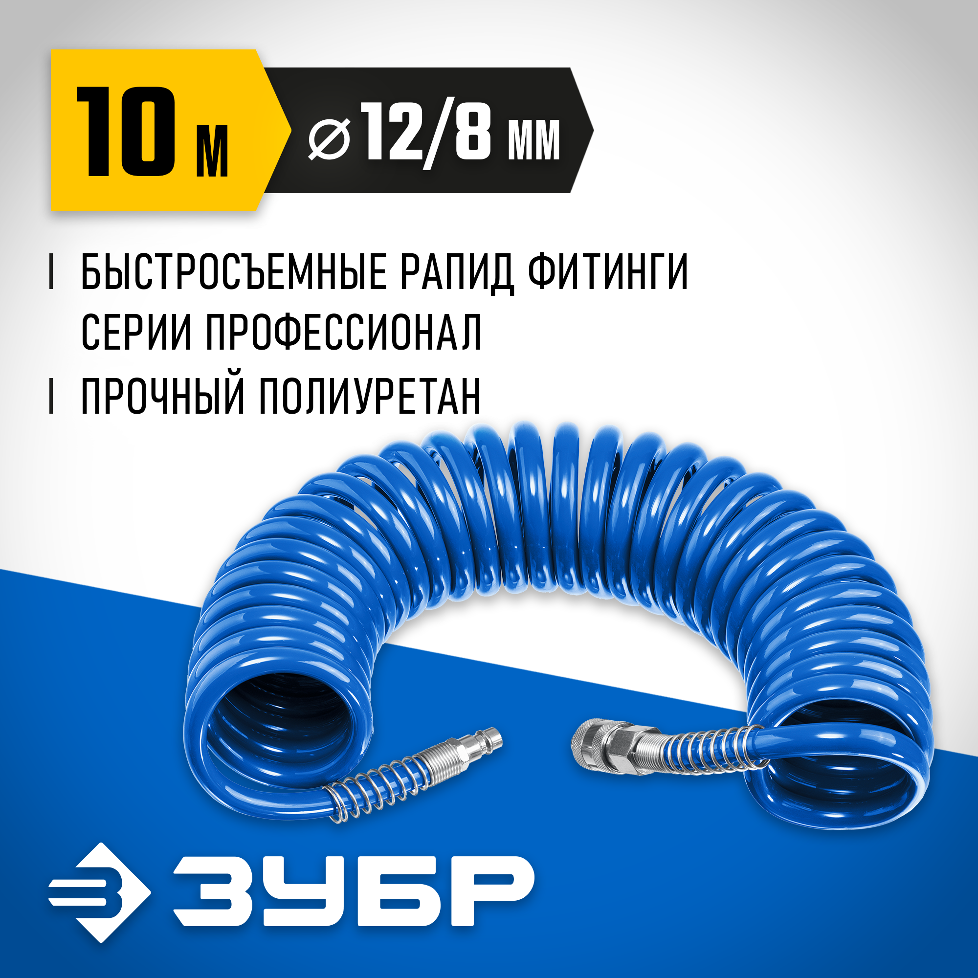 ЗУБР 10 м, 8 х 12 мм, 15 бар, воздушный спиральный шланг с фитингами рапид, Профессионал (6472-10)