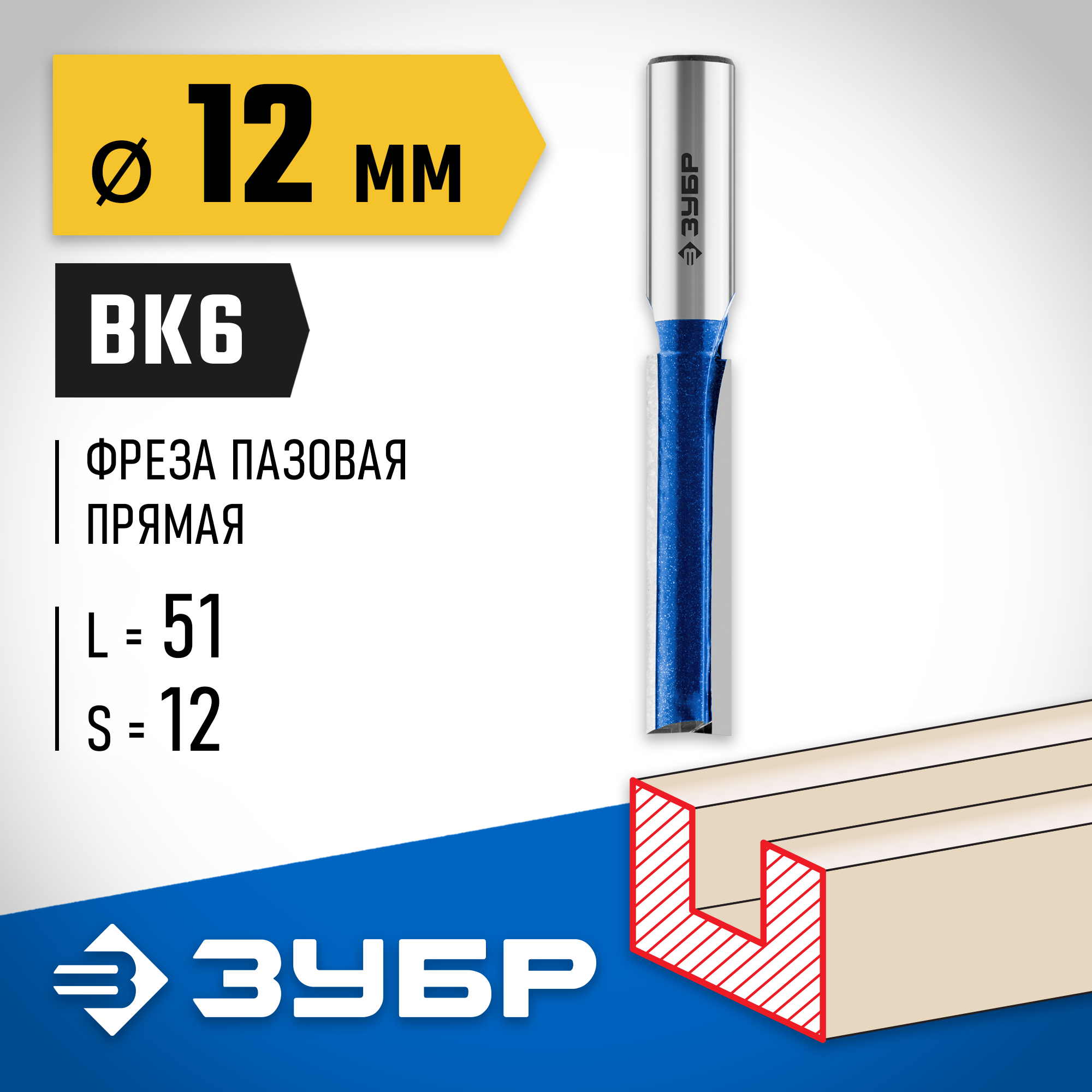 ЗУБР 12 x 51 мм, хвостовик 12 мм, фреза пазовая прямая с нижними подрезателями, Профессионал (28755-12-51)