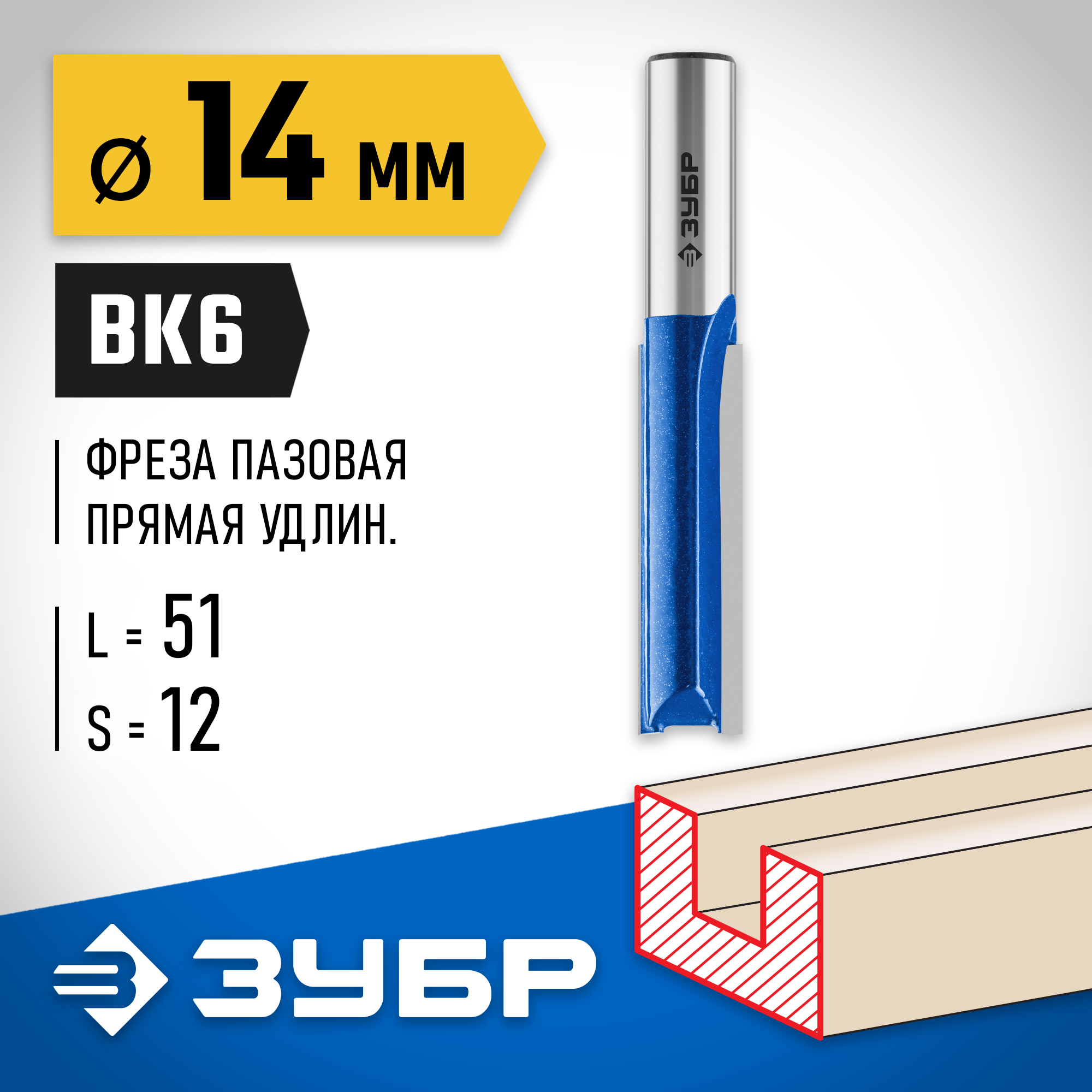 ЗУБР 14 x 51 мм, хвостовик 12 мм, фреза пазовая прямая. удлиненная, Профессионал (28754-14-51)