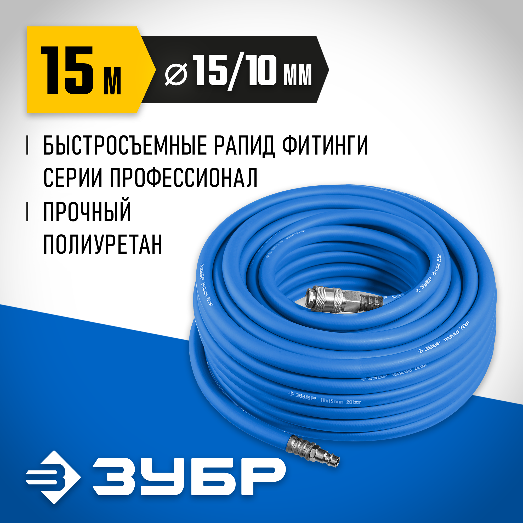ЗУБР 15 м, 10 х 15 мм, 20 бар, воздушный шланг с фитингами рапид, Профессионал (6481-15)