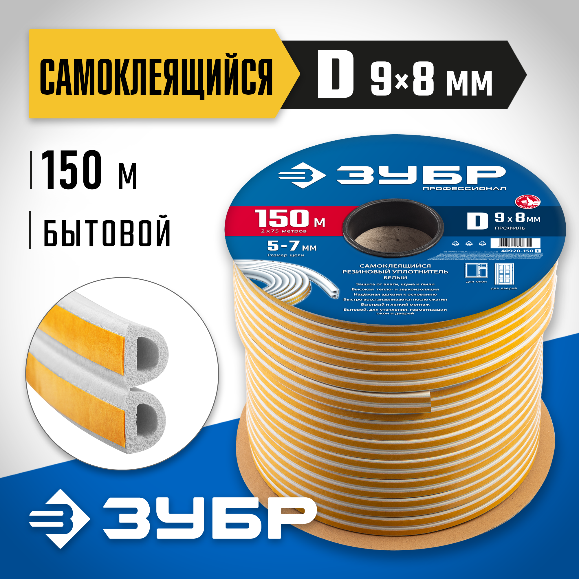 Уплотнитель ЗУБР 150 м, D-профиль, размер 9 х 8 мм, белый, самоклеящийся резиновый уплотнитель, Профессионал (40920-150_z01)