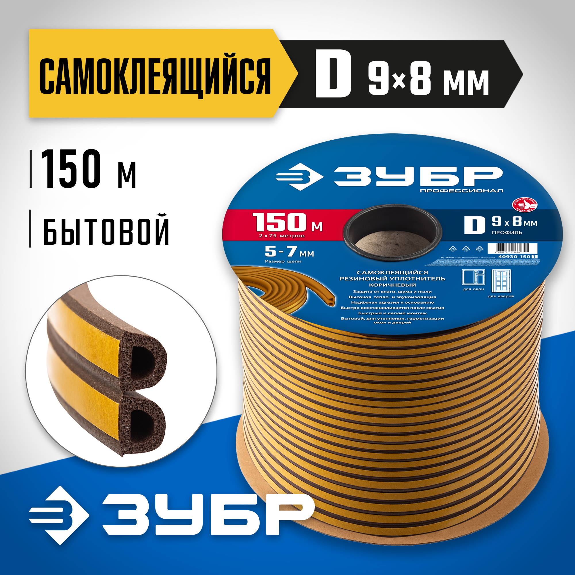 Уплотнитель ЗУБР 150 м, D-профиль, размер 9 х 8 мм, коричневый, самоклеящийся резиновый уплотнитель, Профессионал (40930-150_z01)