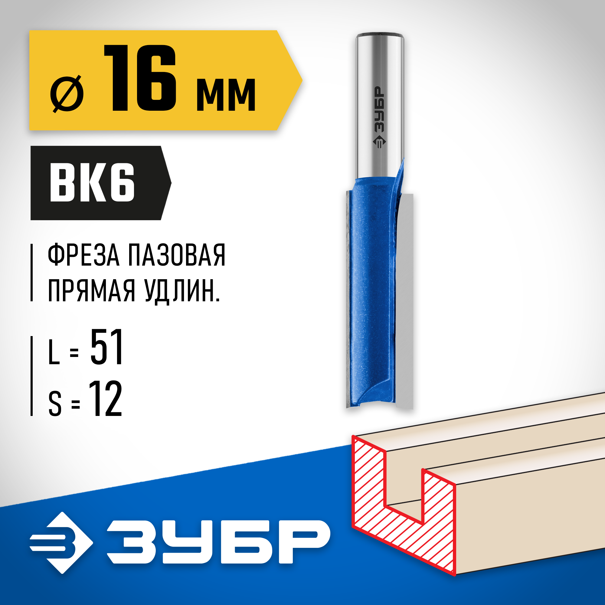 ЗУБР 16 x 51 мм, хвостовик 12 мм, фреза пазовая прямая. удлиненная, Профессионал (28754-16-51)