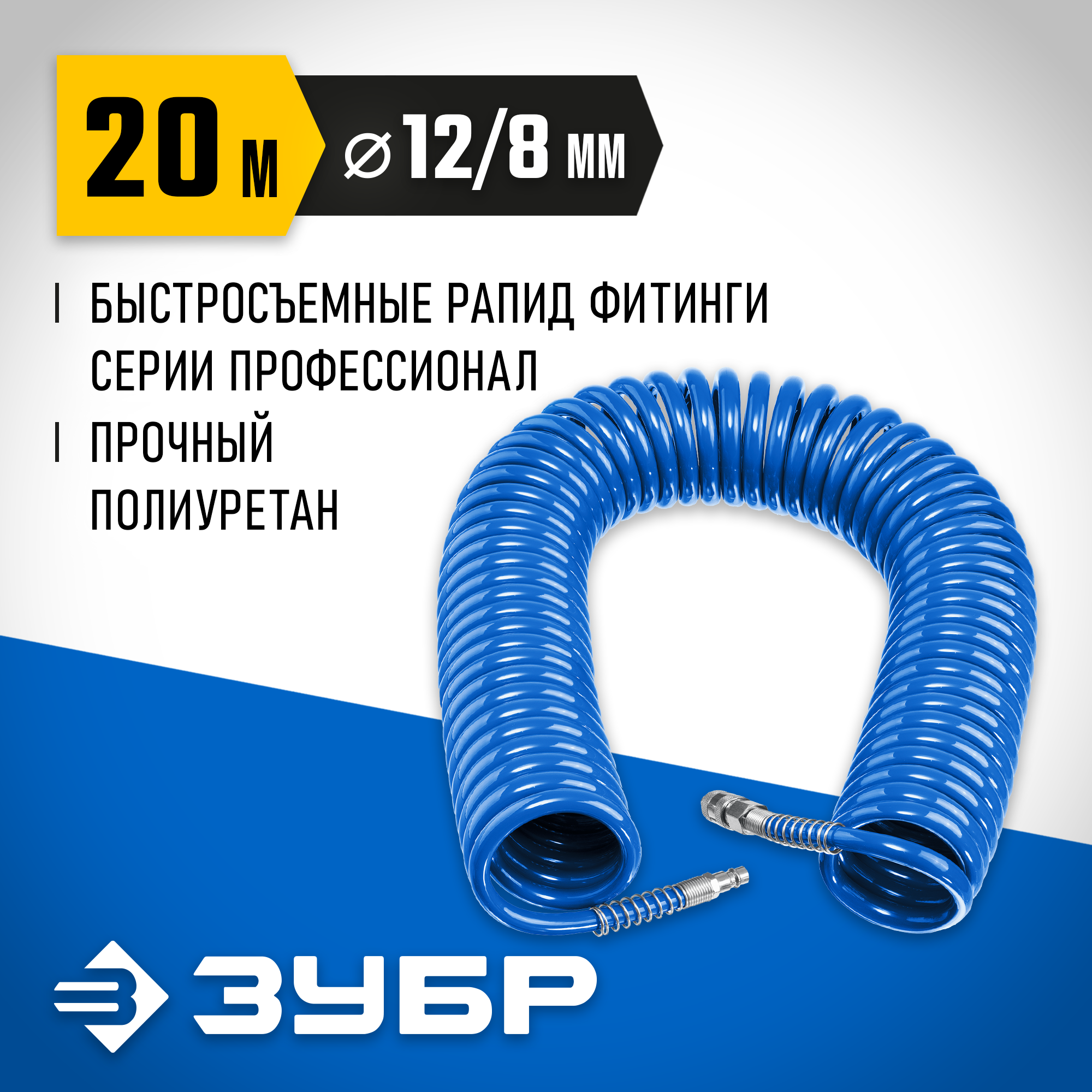 ЗУБР 20 м, 8 х 12 мм, 15 бар, воздушный спиральный шланг с фитингами рапид, Профессионал (6472-20)